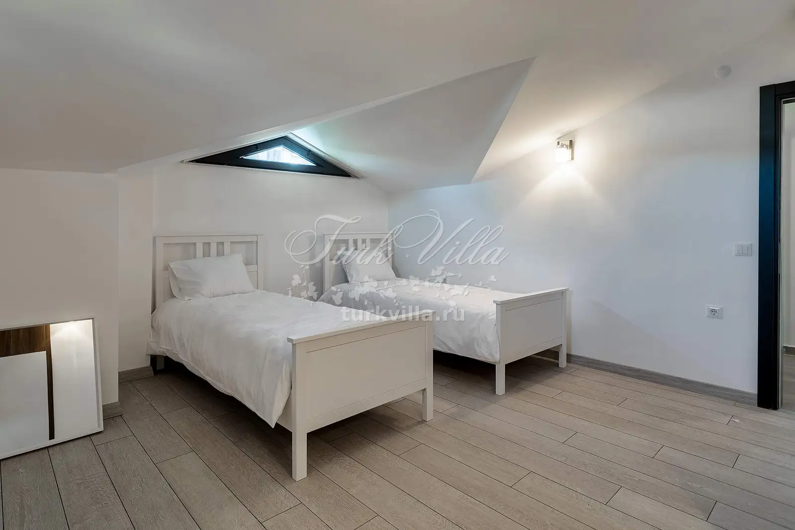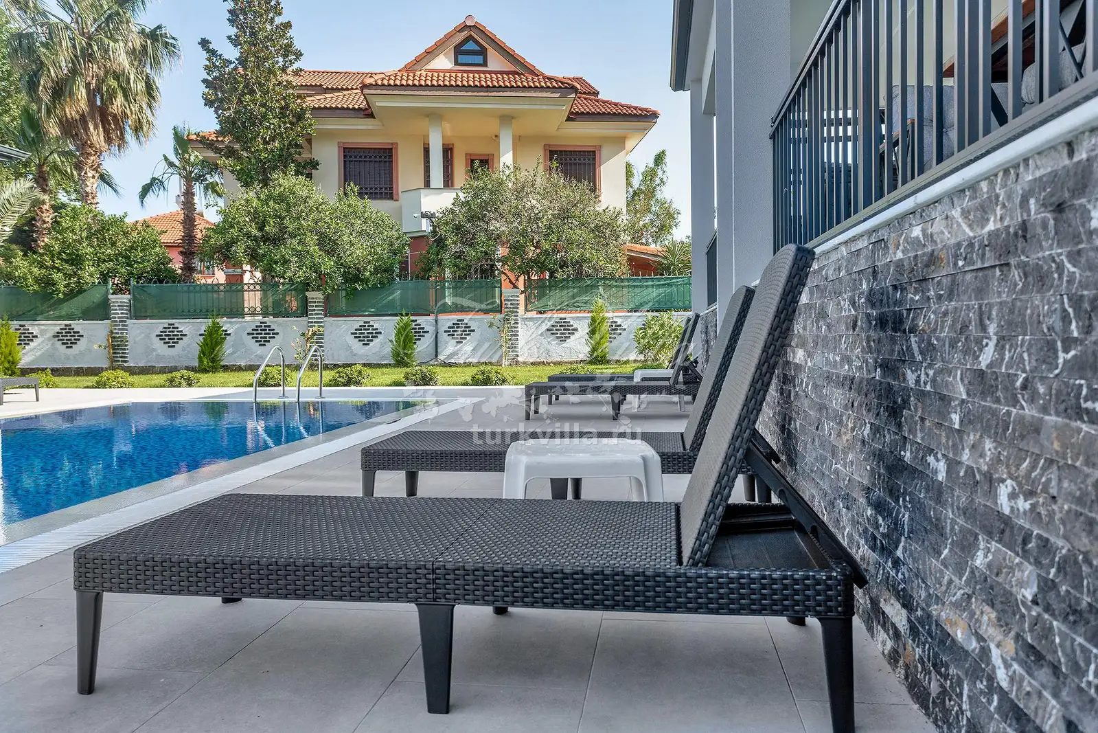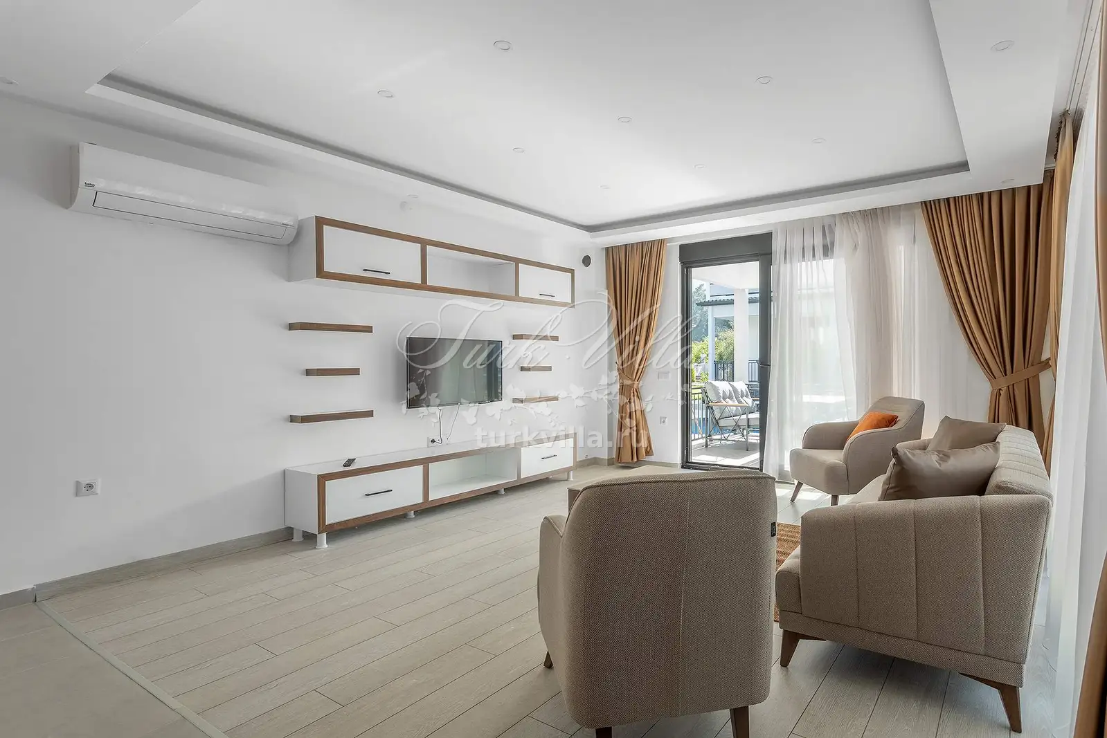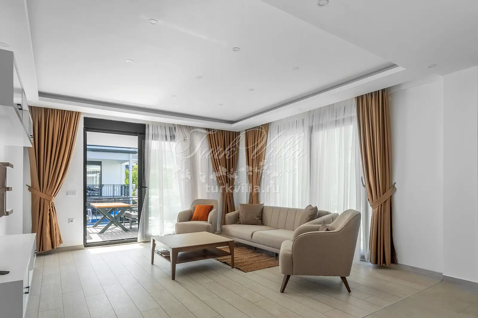 На первом этаже расположена веранда, оборудованная мягкой мебелью для отдыха и имеющая выход к бассейну. Также на первом этаже размещен санузел, просторная гостинная с мягкой мебелью для отдыха, телевизор, интернет и спутниковое телевидение.