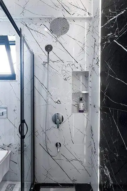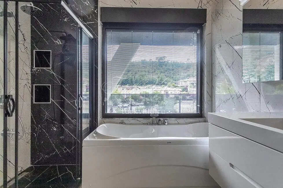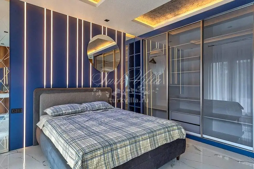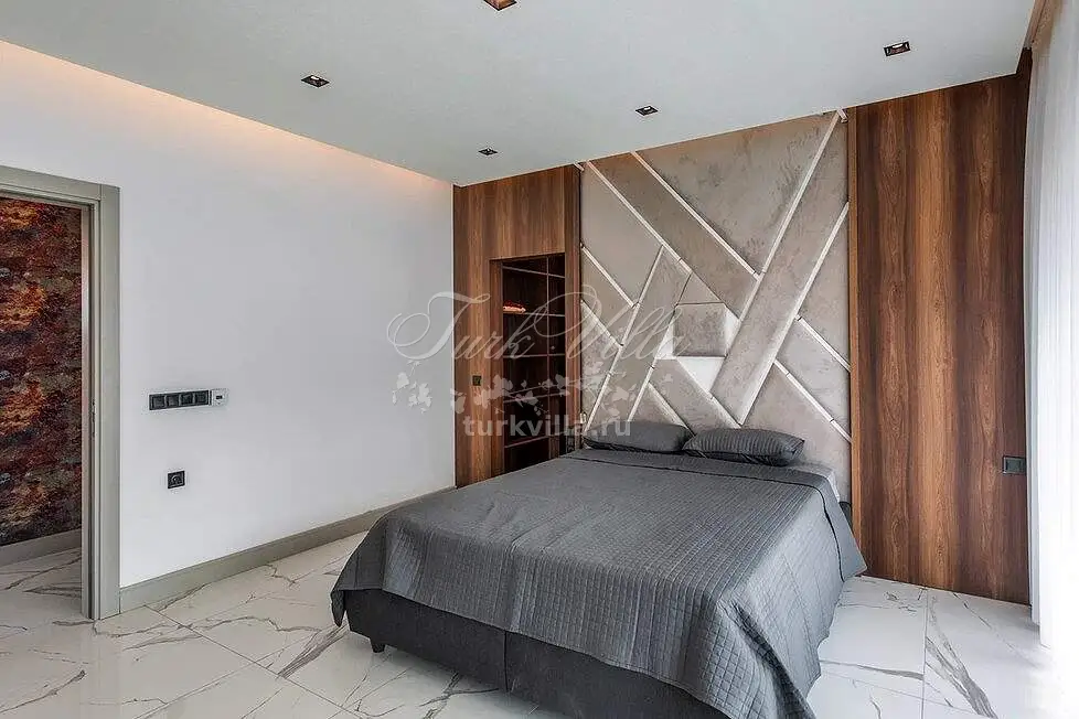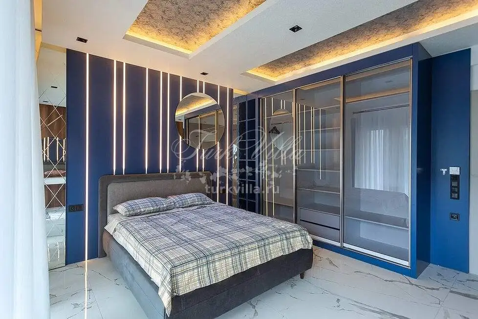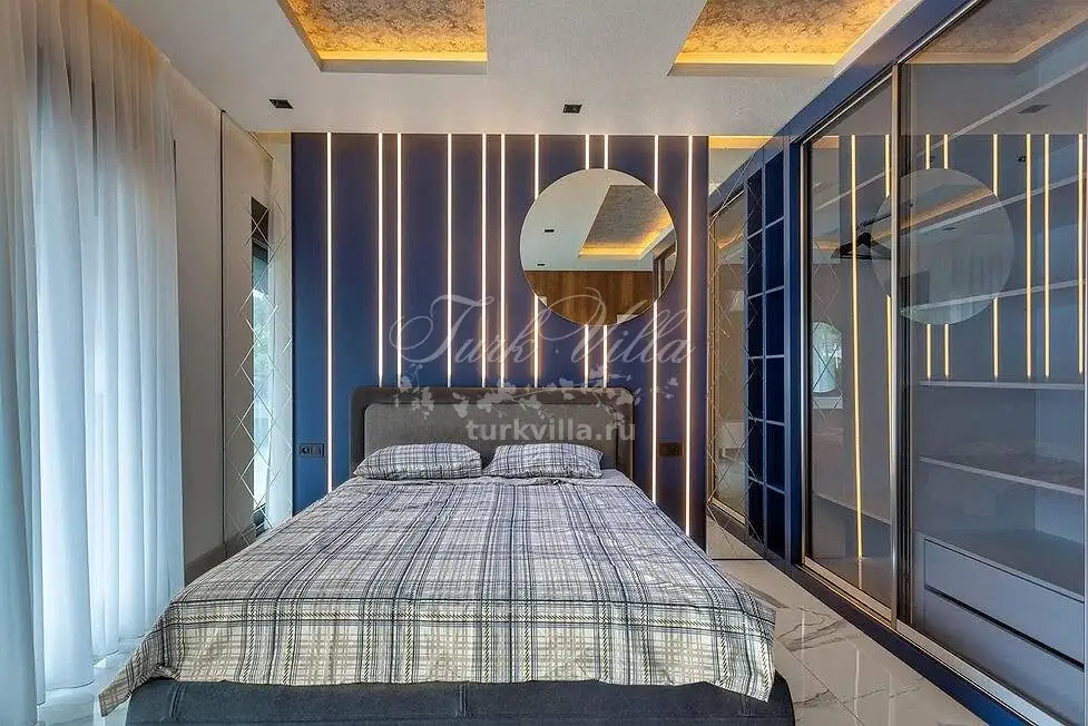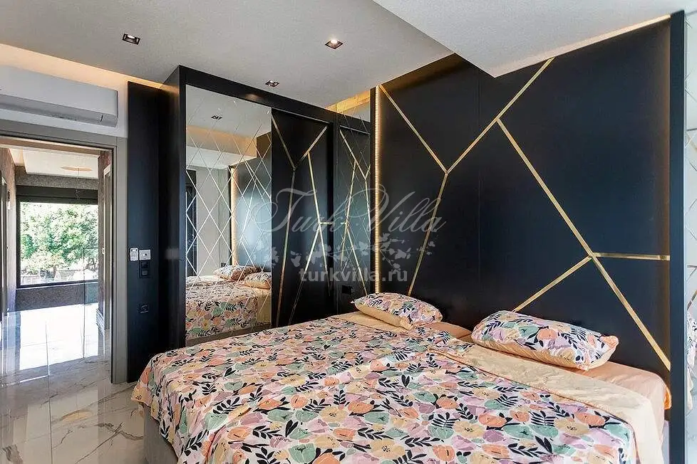 Спальня 1 - двуспальная кровать, большое зеркало трюмо, телевизор, шкаф для хранения одежды, выход на террасу. Ванная комната с душевой кабиной, джакузи и панорамным окном.