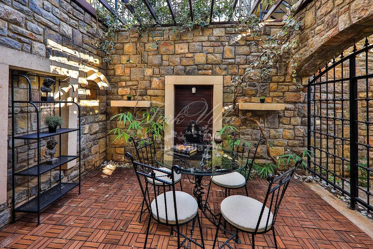 Частный сад, частный бассейн, зона для загара, 6 шезлонгов, зонтики, душ на открытом воздухе, мебель для отдыха.
