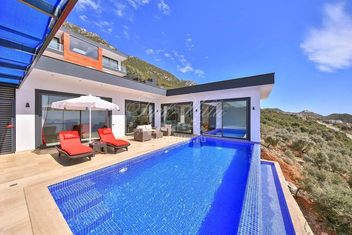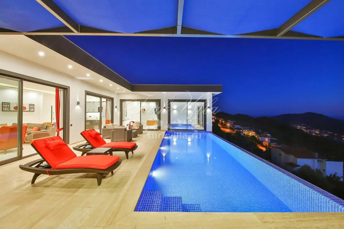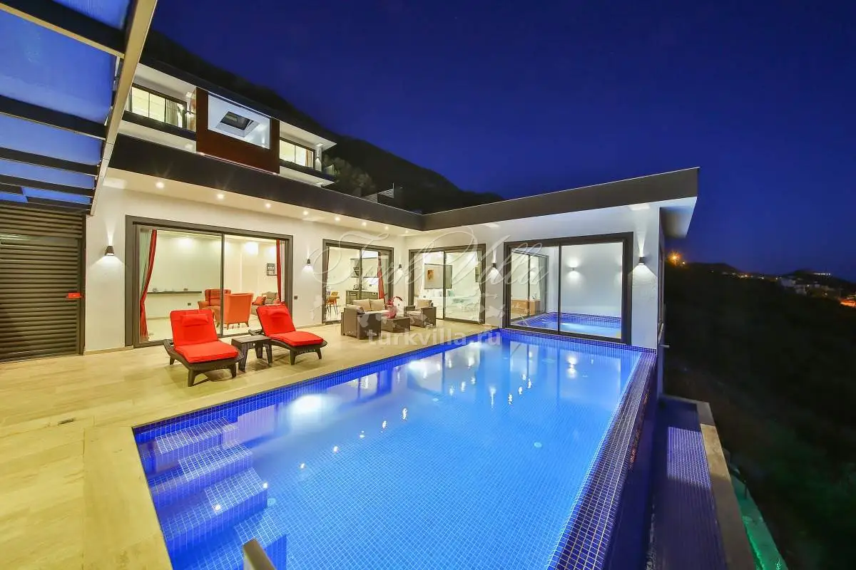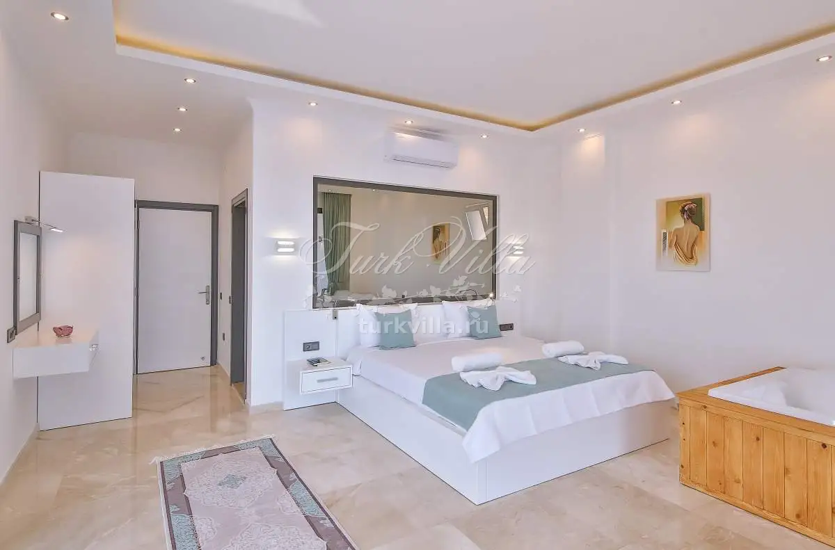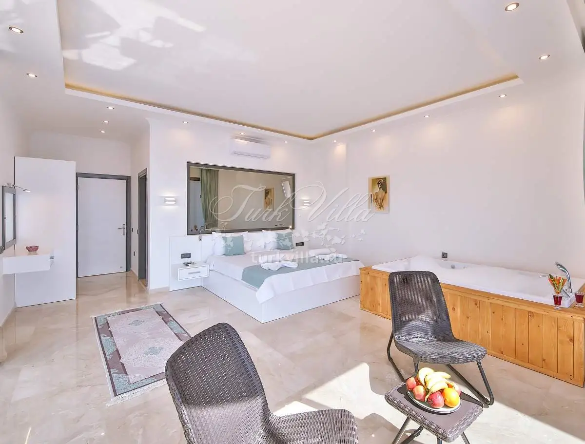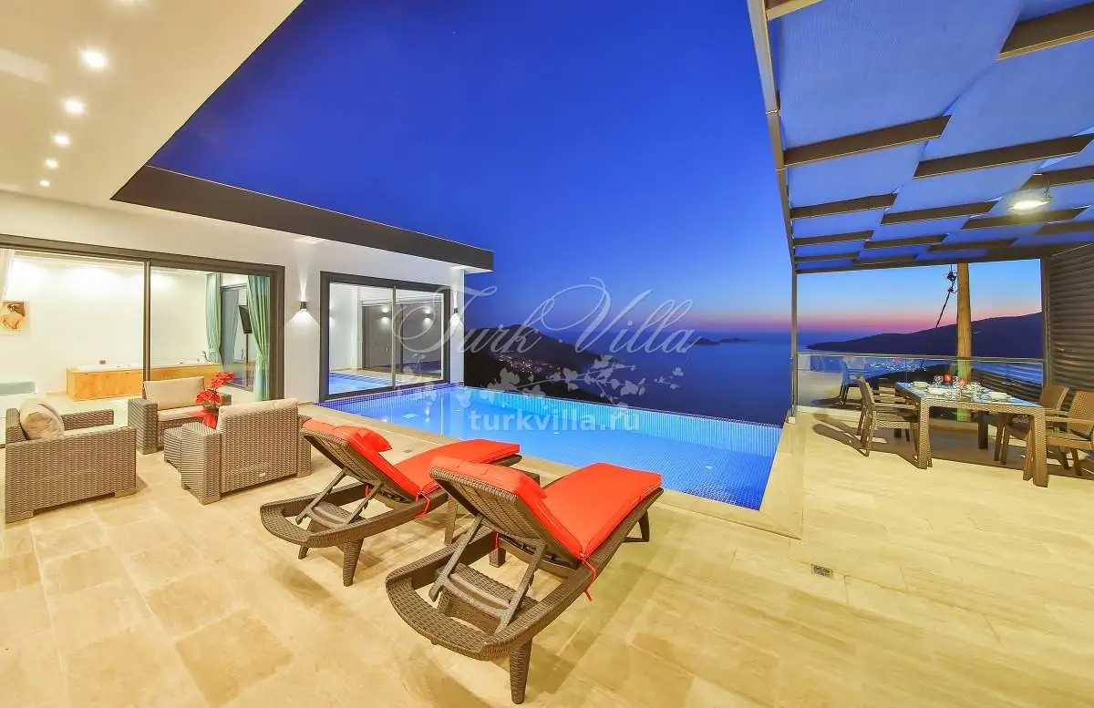Наша роскошная вилла в аренду расположена в месте, переплетенном с природой, у подножия тихих спокойных гор Торос, где можно наблюдать день и ночь за пейзажем очаровательного Калкана, уникальным видом на море и природу из каждой комнаты. Вокруг виллы нет интенсивной застройки. Частный бассейн и сад нашей виллы защищены от глаз посторонних. В спальне установлено джакузи и бассейн со стеклянным потолком и видом на море. В связи с этим наша вилла является идеальным вариантом для отдыхающих и особенно молодоженов, которые хотят уединения.
