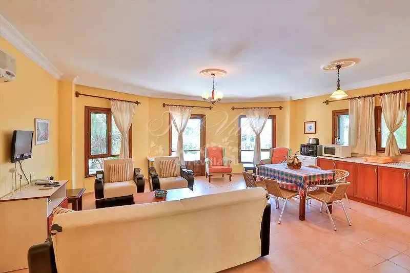 Комплекс вилл и апартаментов с общей ухоженной и очень зеленой территорией. В комплексе предоставляется круглосуточное обслуживание номеров. Вилла 2+1 имеет площадь 144 м2, общий бассейн.