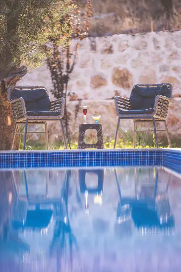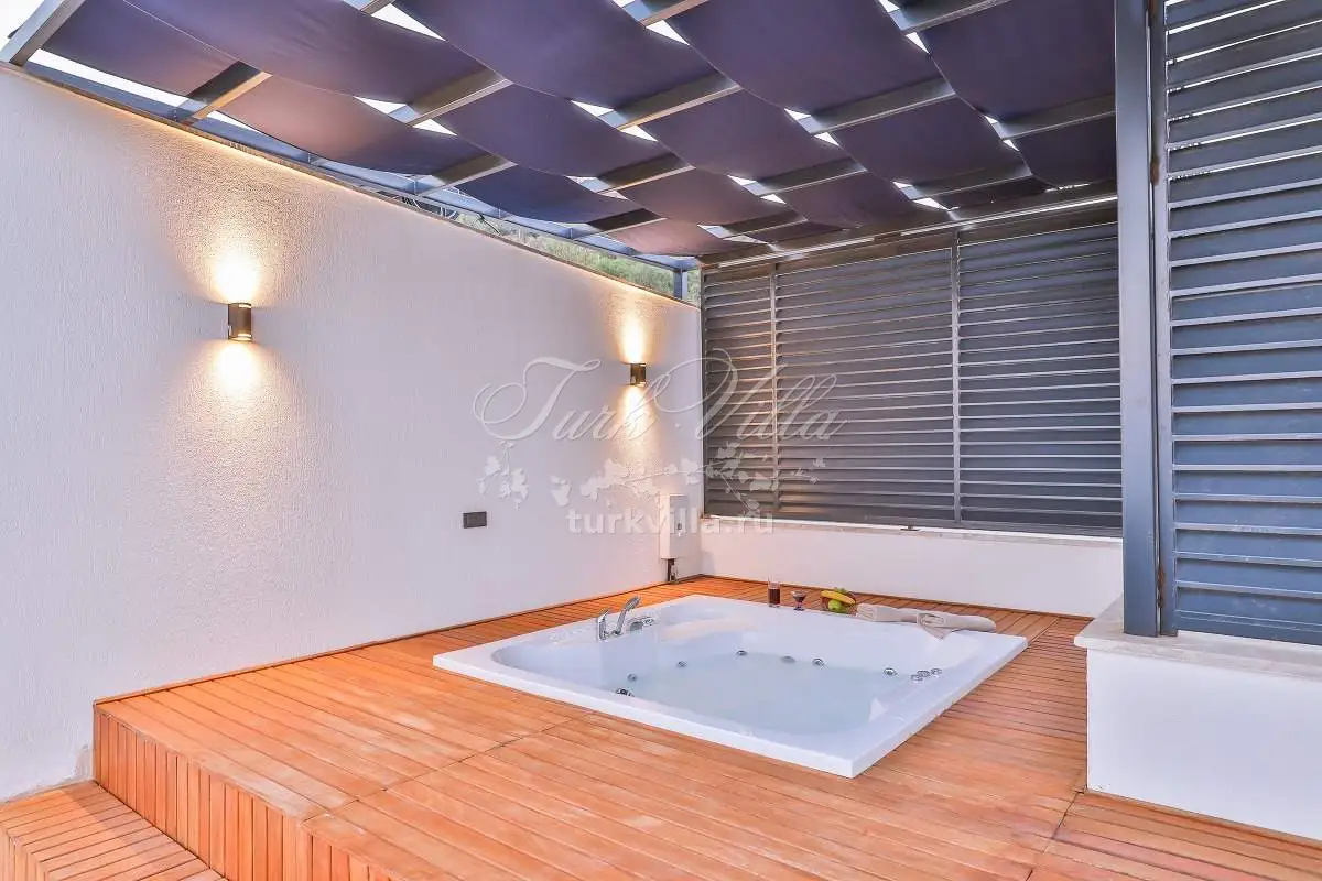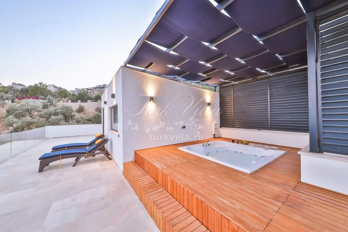 Джакузи на открытом воздухе с видом на море, шезлонги, мебель для отдыха.
