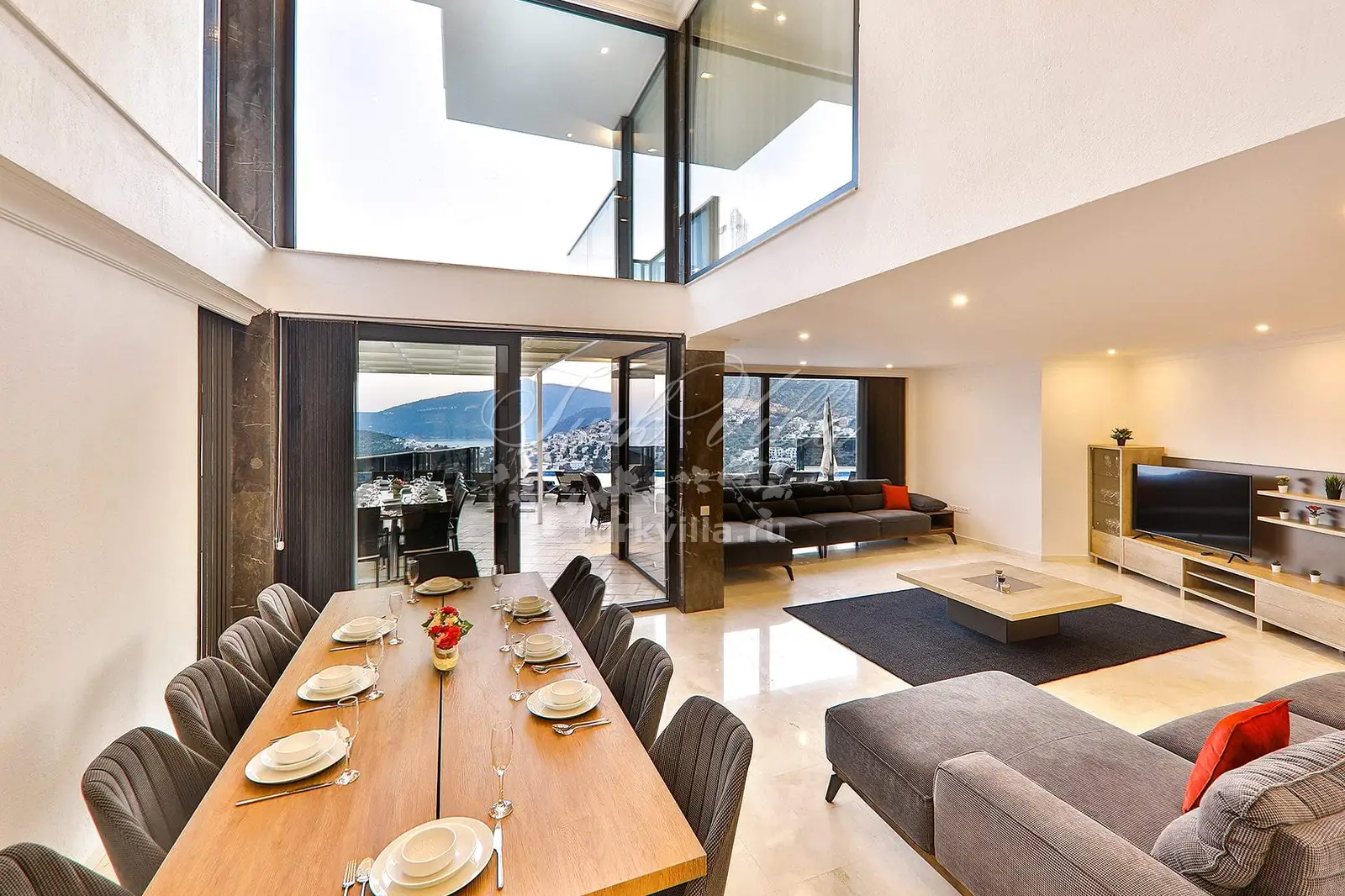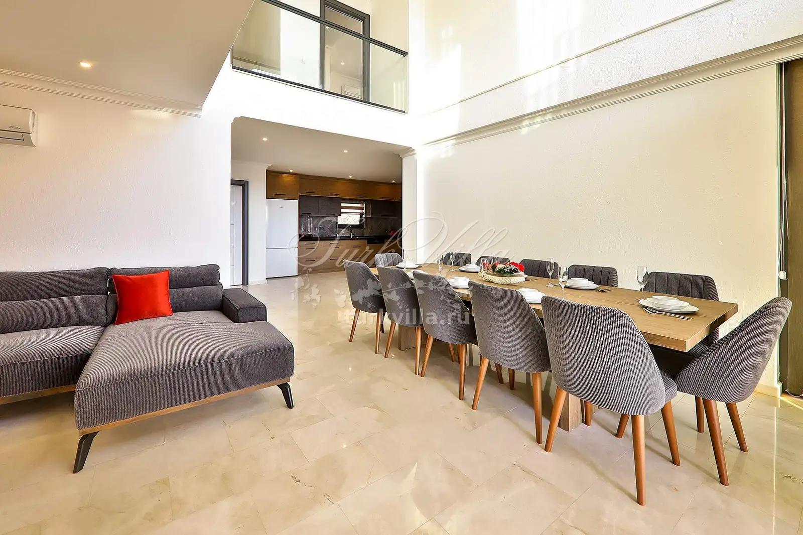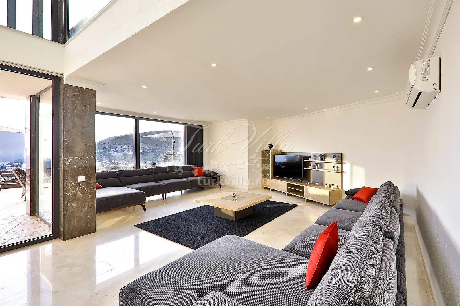 Гостиная: вид на море и природу, мебель для отдыха, спутниковое телевидение (ЖК), беспроводной Интернет, кондиционер, обеденный стол на 14 человек, выход на террасу у бассейна.