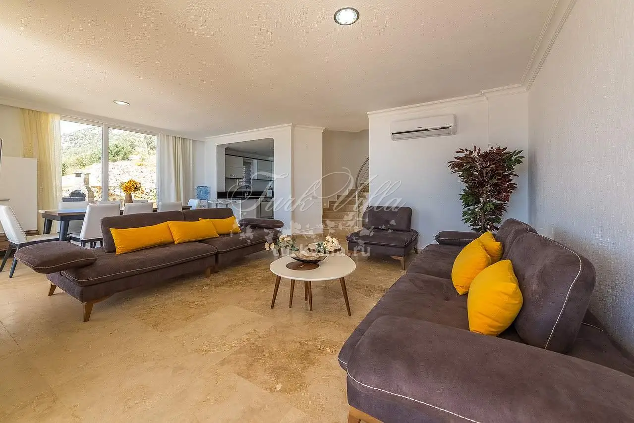 Гостиная: мебель для отдыха, спутниковое телевидение (ЖК), беспроводной доступ в Интернет, кондиционер, обеденный стол на 10 человек, выход на террасу у бассейна.