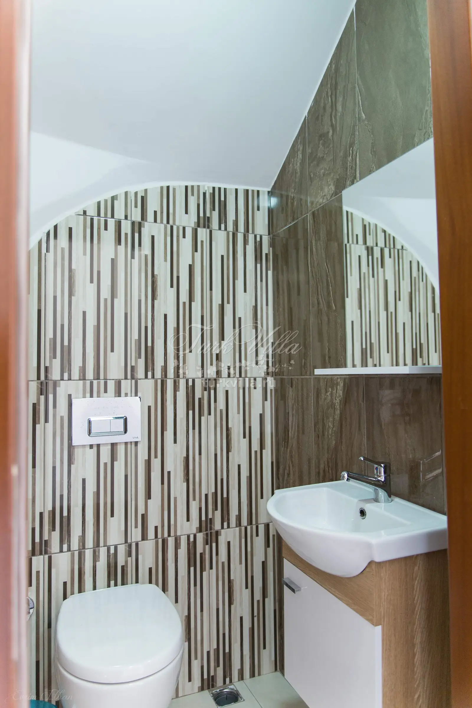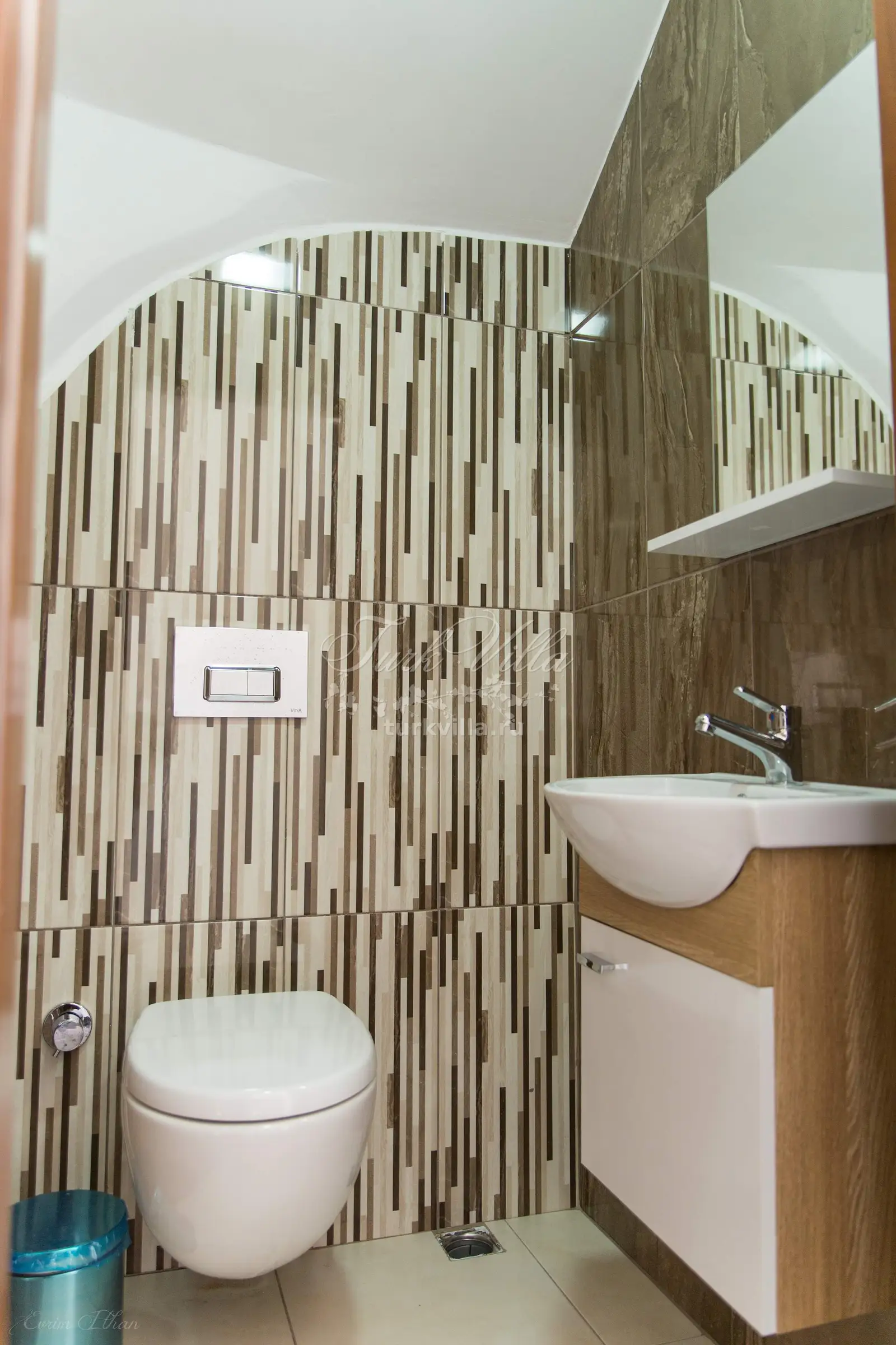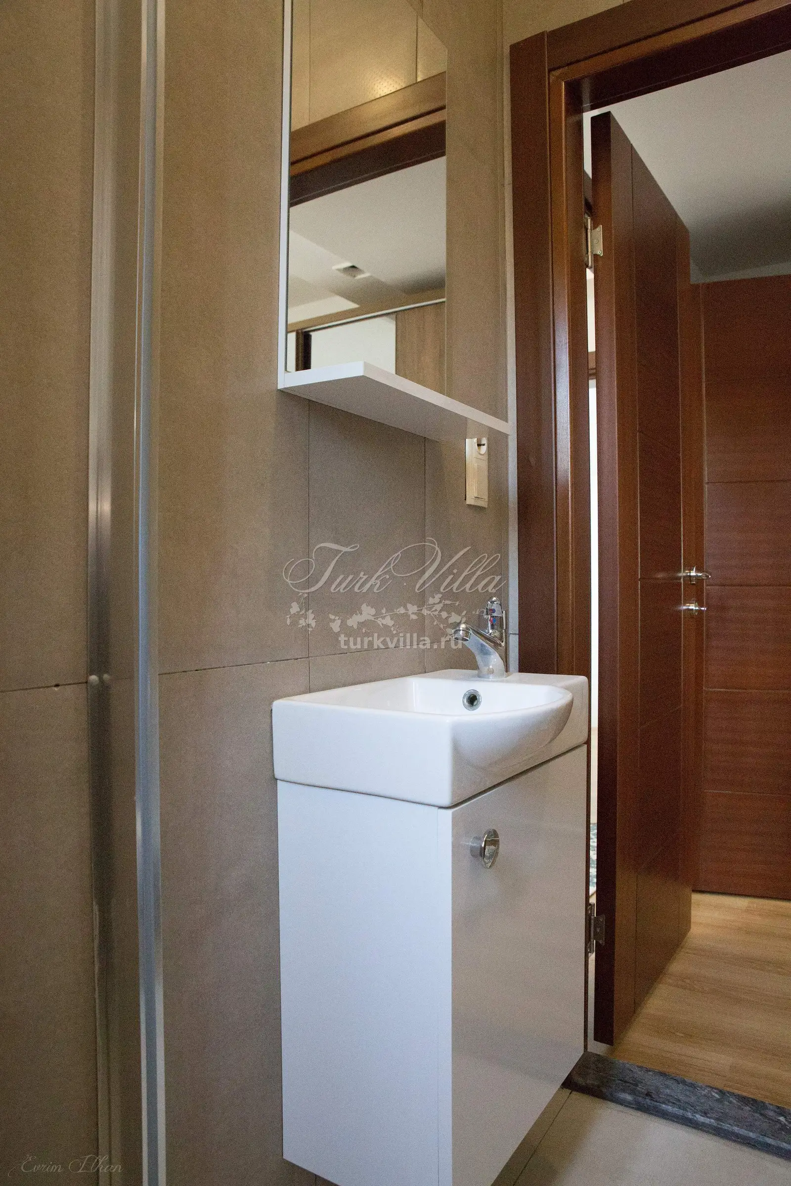 Туалет / умывальник, выход на террасу с большим садом с газоном и ландшафтным дизайном.