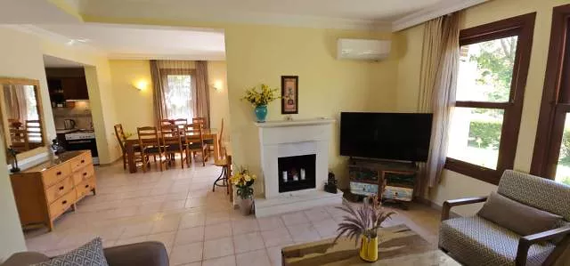 В гостиной вы найдете мебель для отдыха, спутниковое телевидение, журнальный столик и кондиционер для комфортного пребывания в жаркое время года.