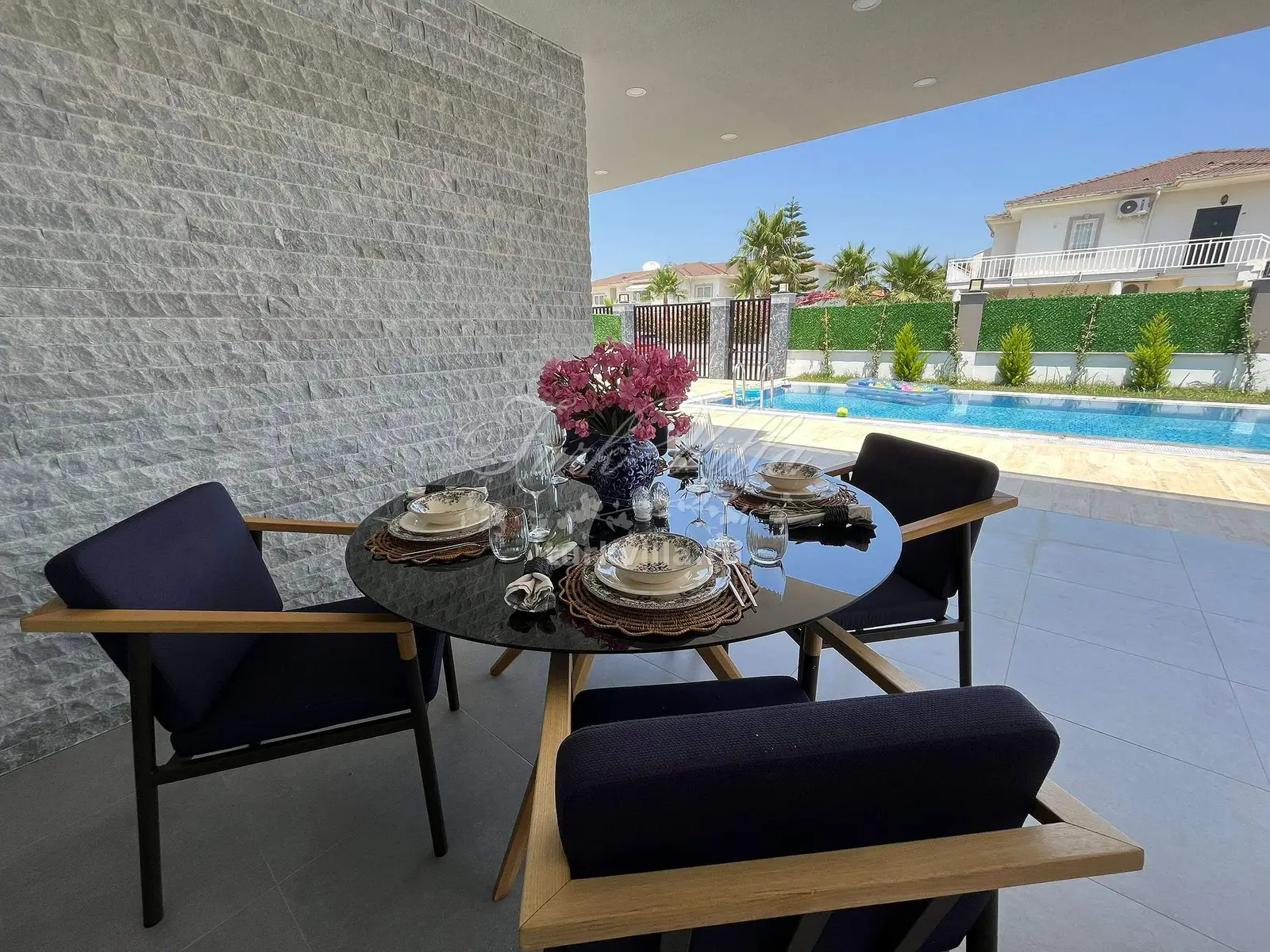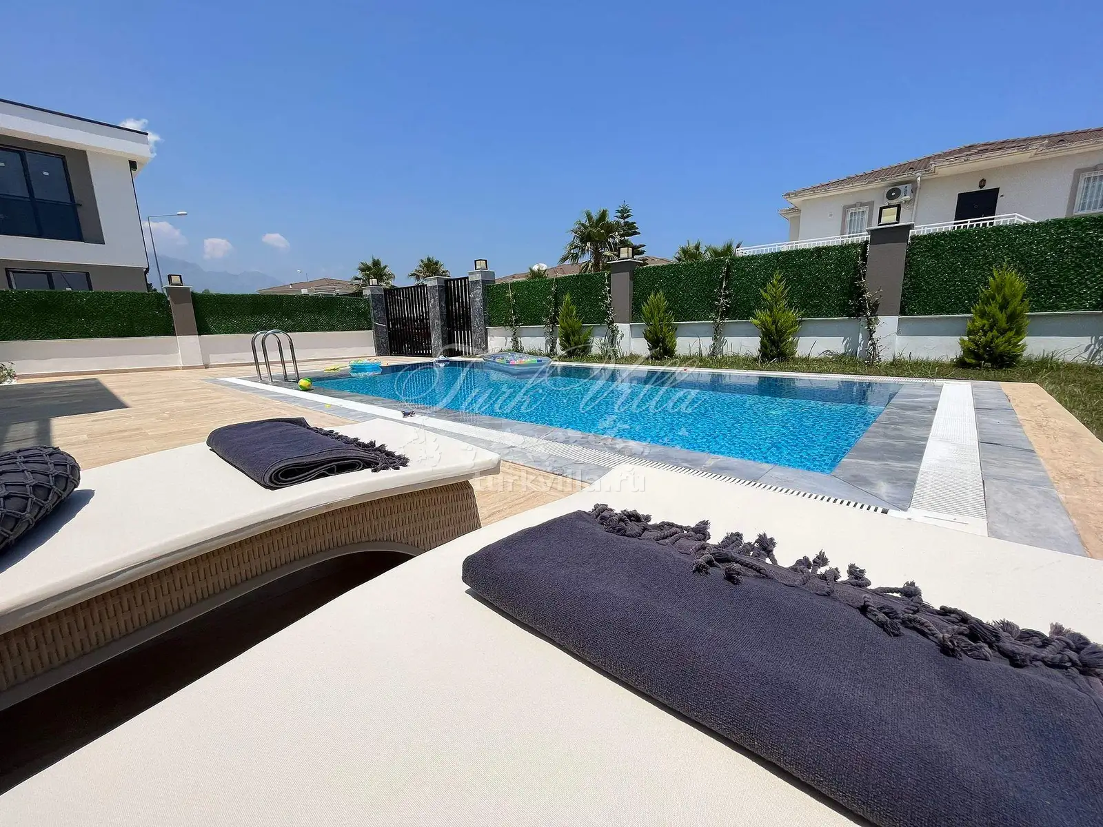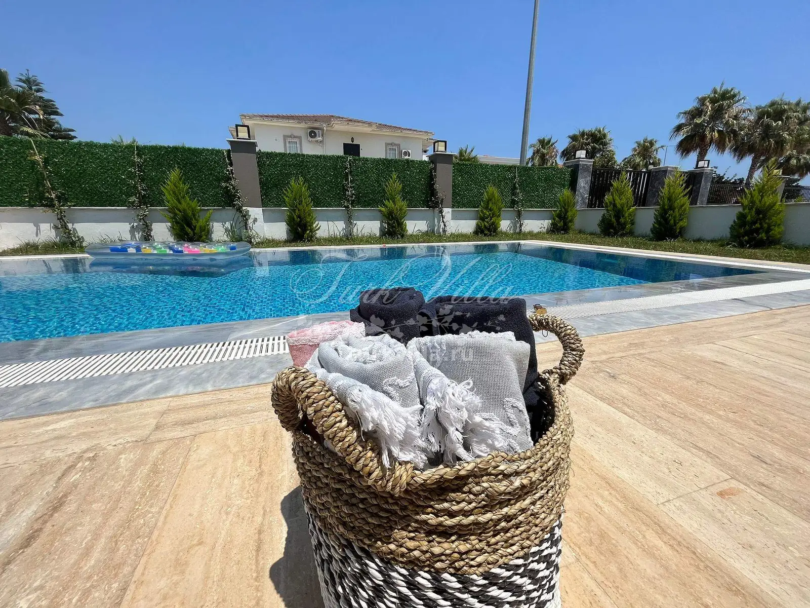 Приватная территория с бассейном: Наши гости могут наслаждаться просторным и ухоженным садом с большим бассейном, окруженным шезлонгами и зоной для отдыха под солнцем. Огороженная территория виллы обеспечит вам частную атмосферу и спокойствие.