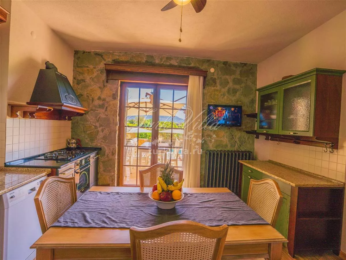 Современная кухня (на первом этаже): Телевизор, Холодильник, Стиральная машина, Посудомоечная машина, Духовка, Тостер, 4-комфорочная плита, Электрический чайник, Набор посуды на 8 персон, Сковороды, Кастрюли, выход на террасу у бассейна.