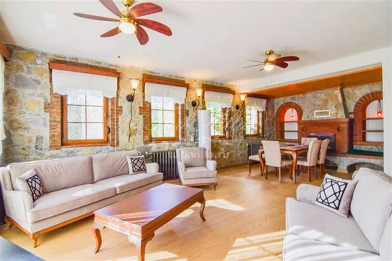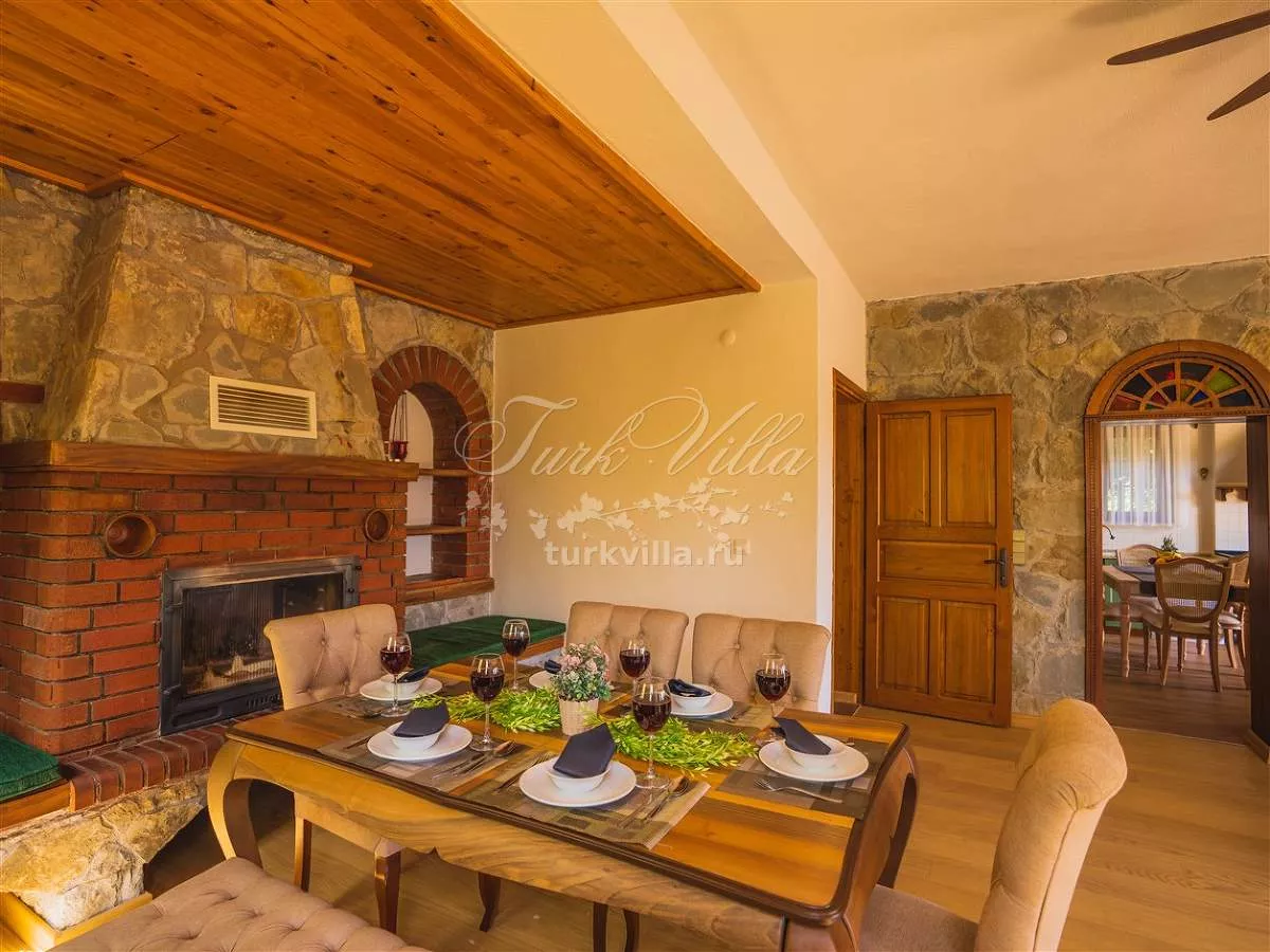 Гостиная с камином (на первом этаже): Гостиная зона, Телевизор, Кондиционер, Обеденный стол на 6 человек, Камин и выход в сад и к бассейну.