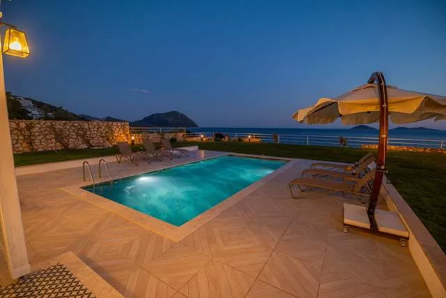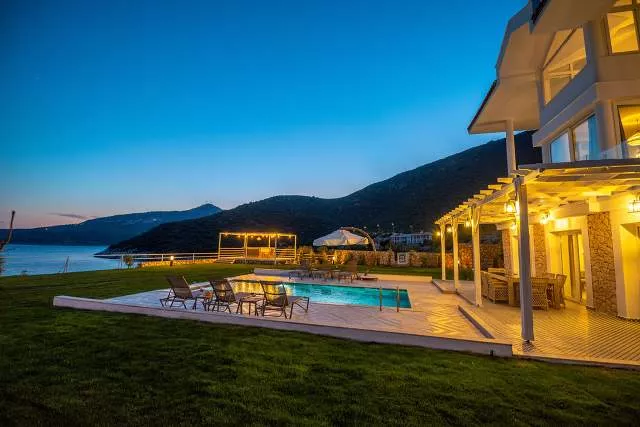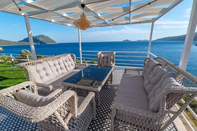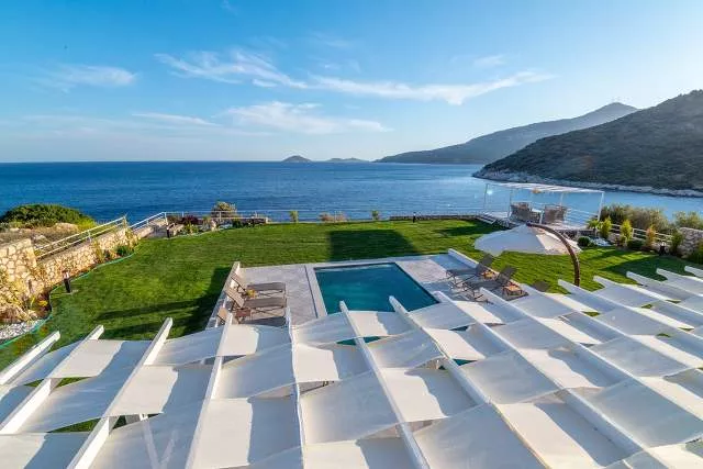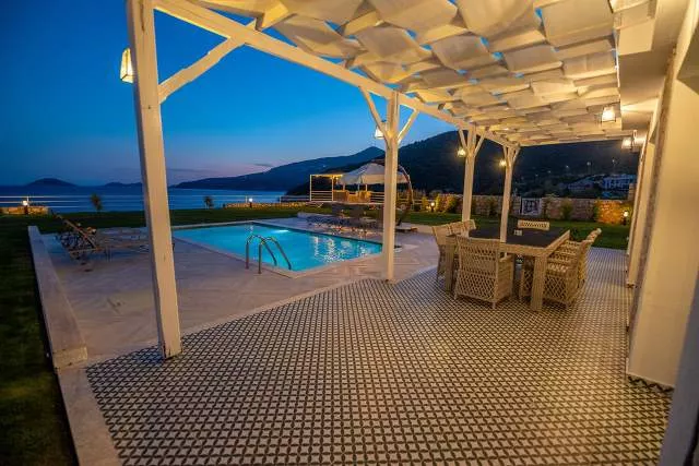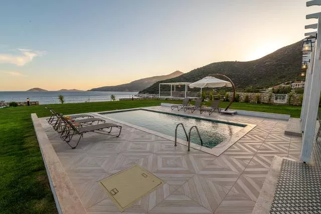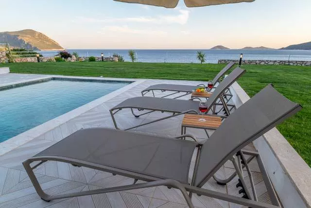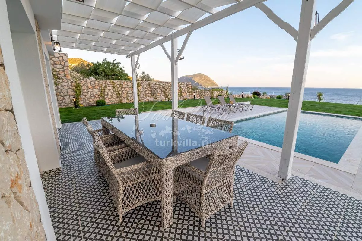 Терраса у бассейна: Прекрасная зона для загара с видом на море, Частный бассейн, Частный сад, Беседка, Закрытая парковка и Платформа для купания в море.