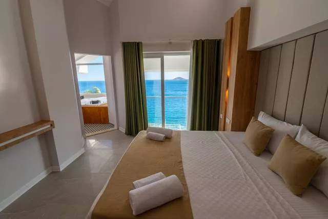 Спальня 1 - Двуспальная кровать, Гардеробная, Косметический столик, Тумбочка, Кондиционер, Балкон с видом на море и ванная комната с туалетом.