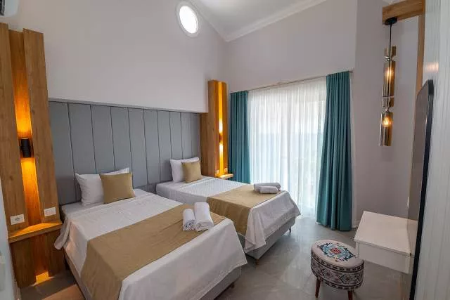Спальня 4 - раздельные кровати, Гардеробная, Косметический столик, Тумбочка, Кондиционер, Балкон с видом на море и ванная комната.