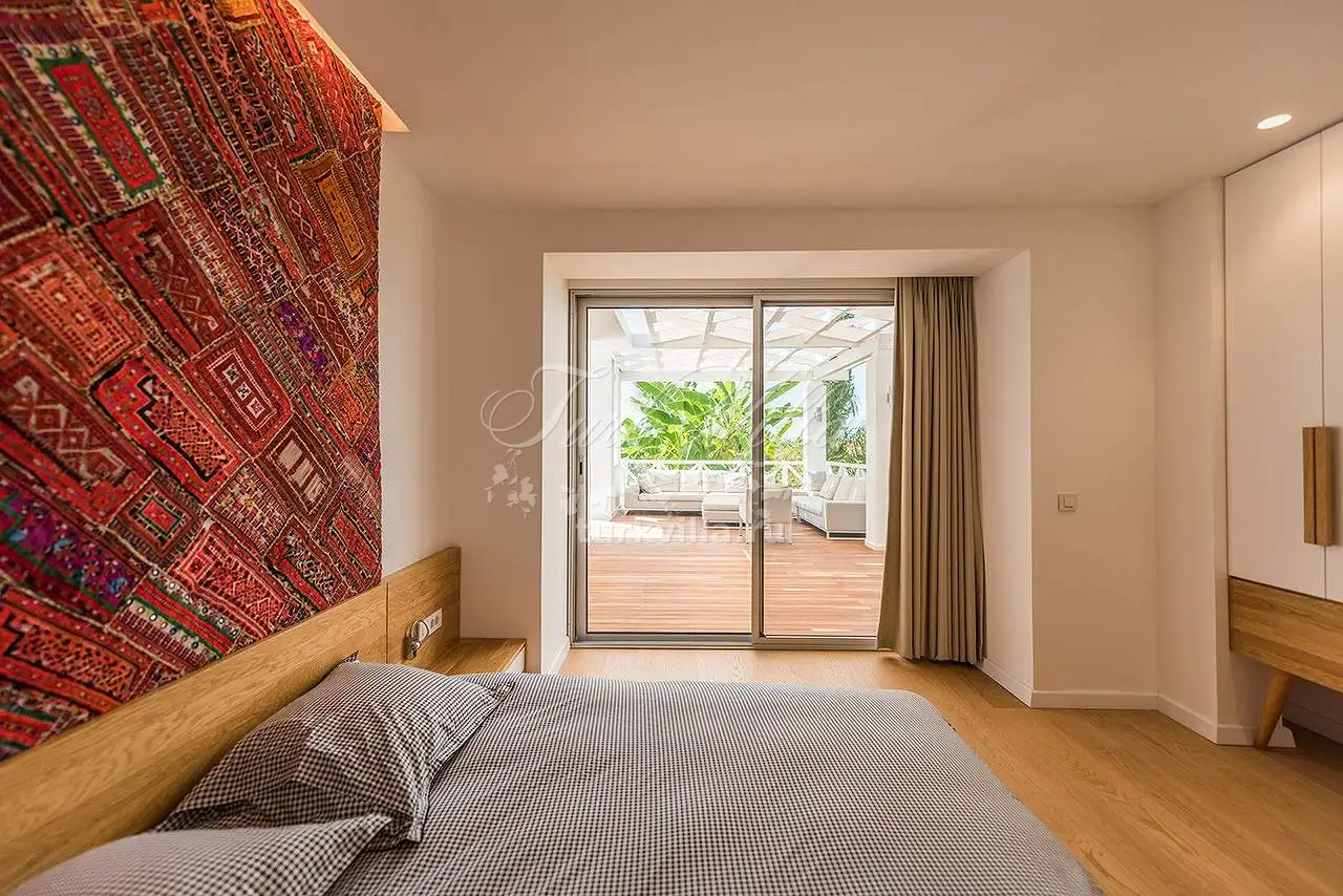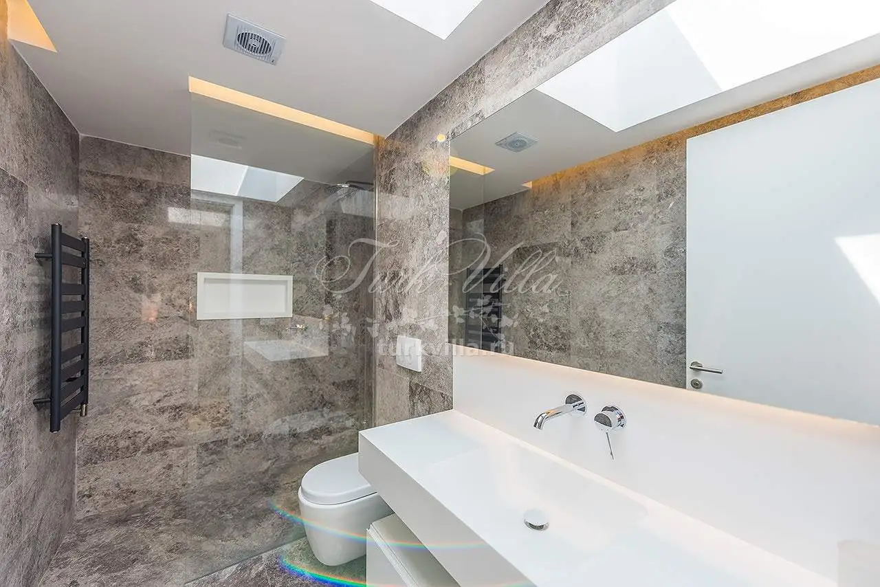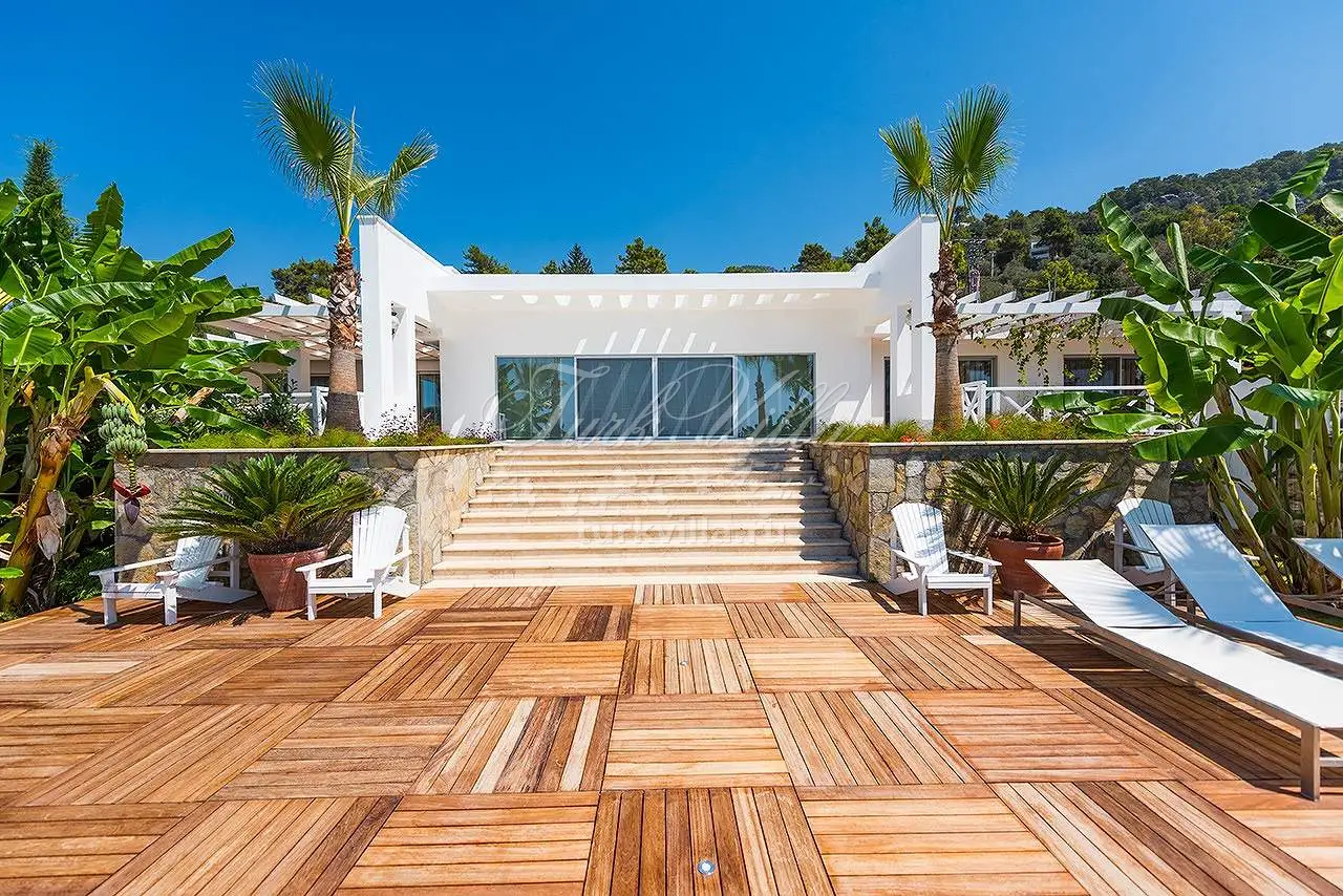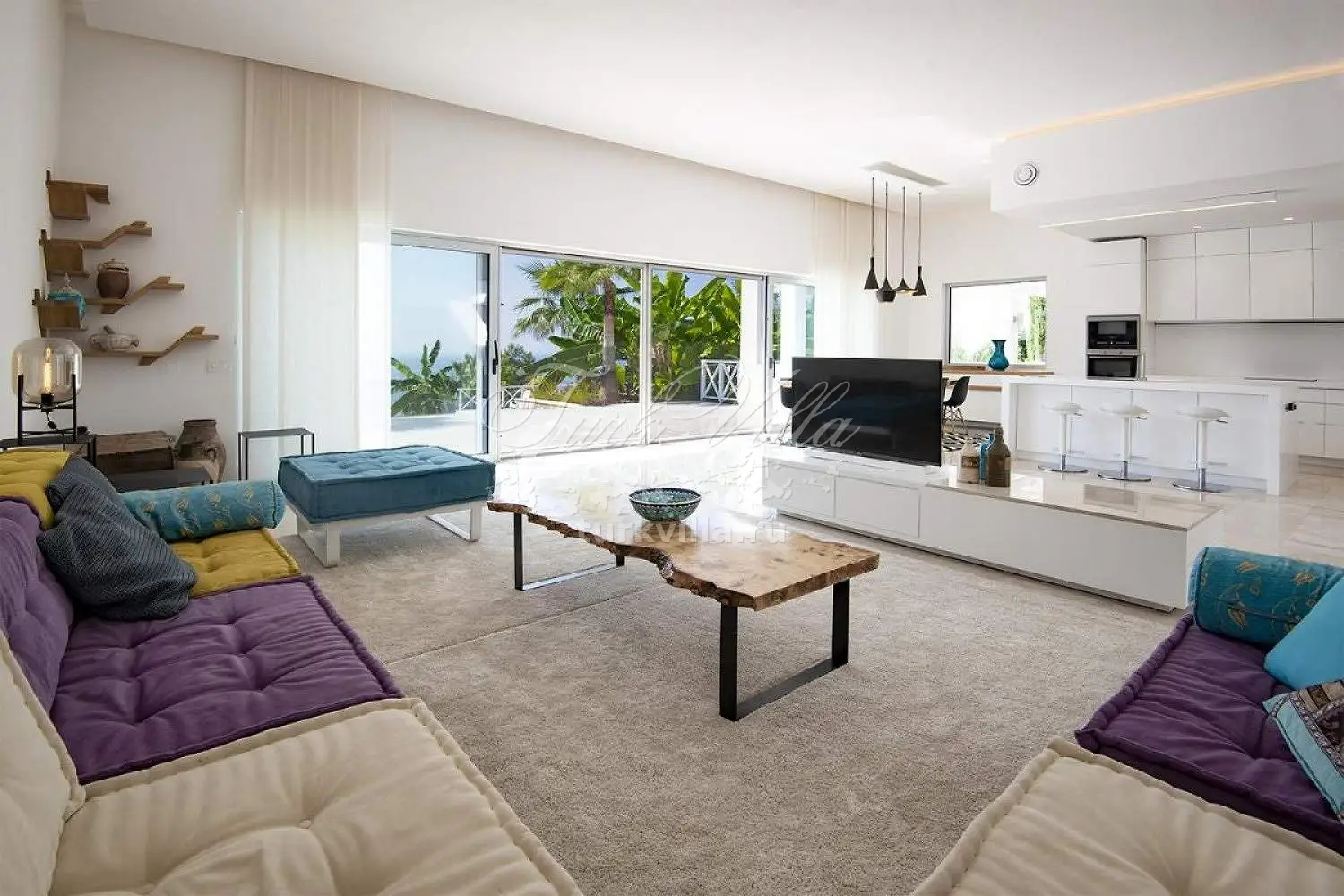 Гостиная: вид на море и природу, мебель для отдыха, спутниковое телевидение (ЖК), беспроводной Интернет, кондиционер, обеденный стол на 8 человек, выход на террасу у бассейна, санузел.
