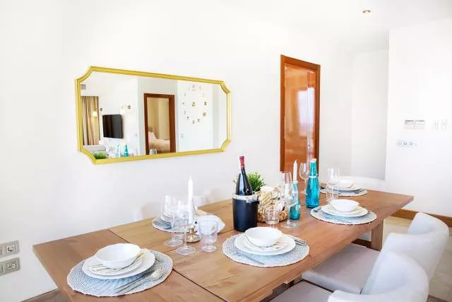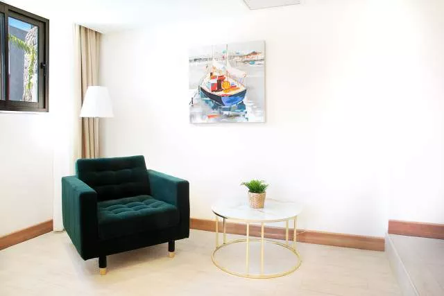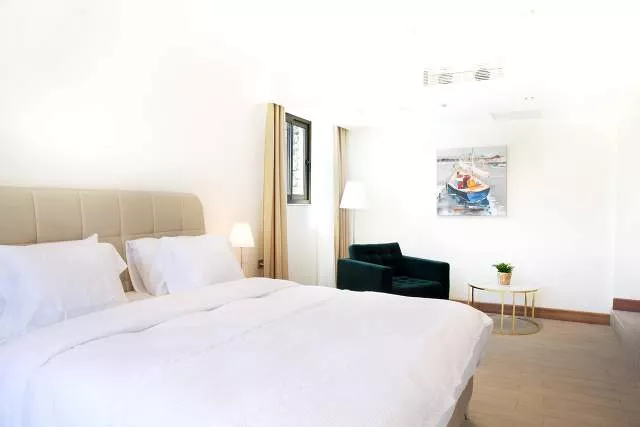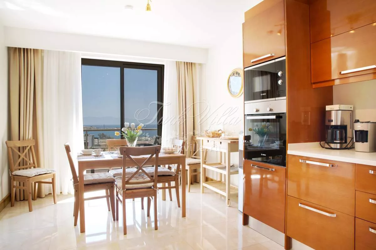 Второй этаж: Просторная гостиная с обеденной зоной и выходом на балкон с видом на море. Одна спальня для одноместного размещения, кухня, общая ванная комната.