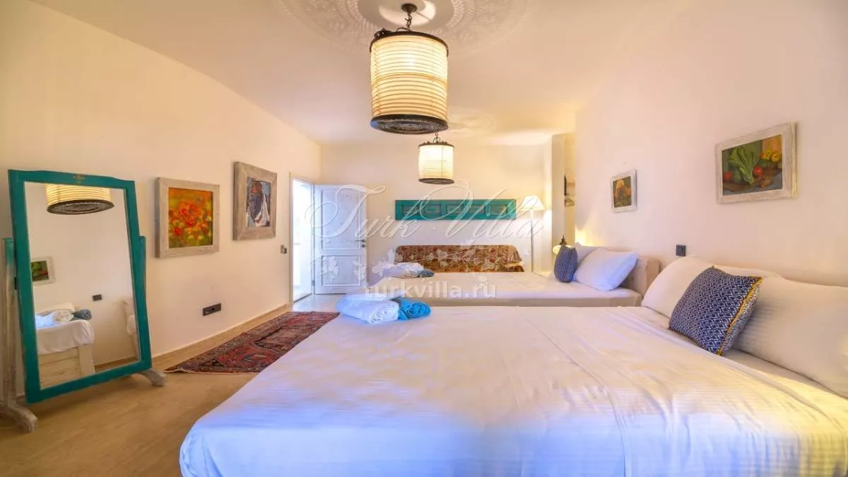 Спальня 5: Оборудована двумя односпальными кроватями, тумбочкой, гардеробом и кондиционером. Ванная комната и выход на террасу с видом на море и природу.