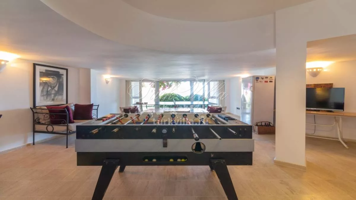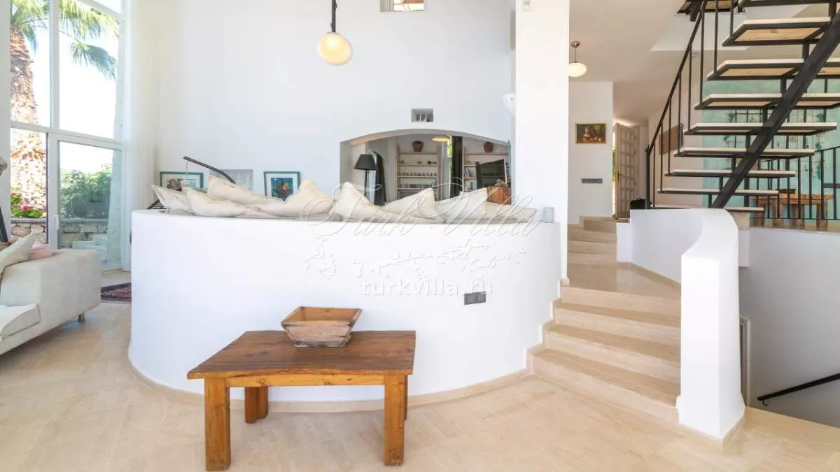 Гостиная: Открытая терраса с видом на море и природу, современная мебель, спутниковое ТВ (LCD), DVD-плеер, камин, кондиционер, обеденный стол на 8 человек и ванная комната.