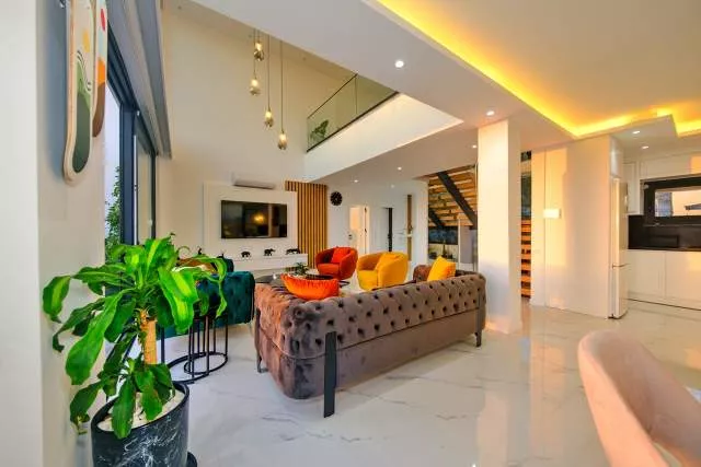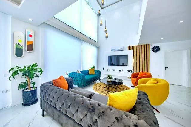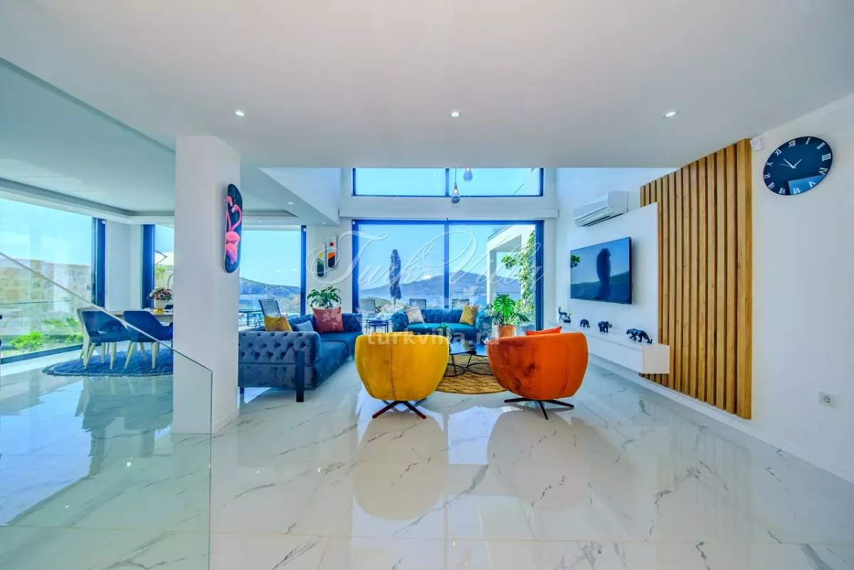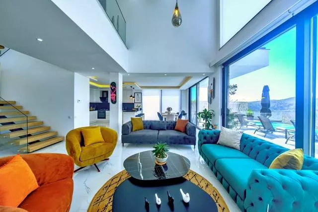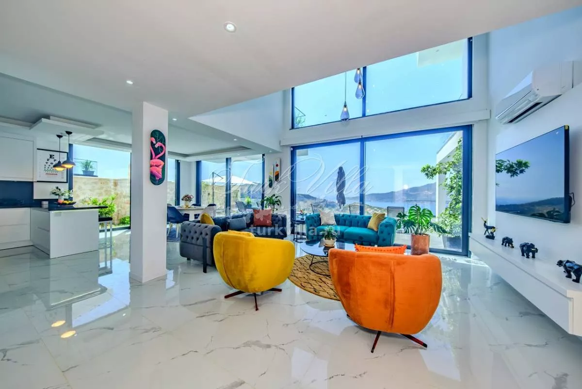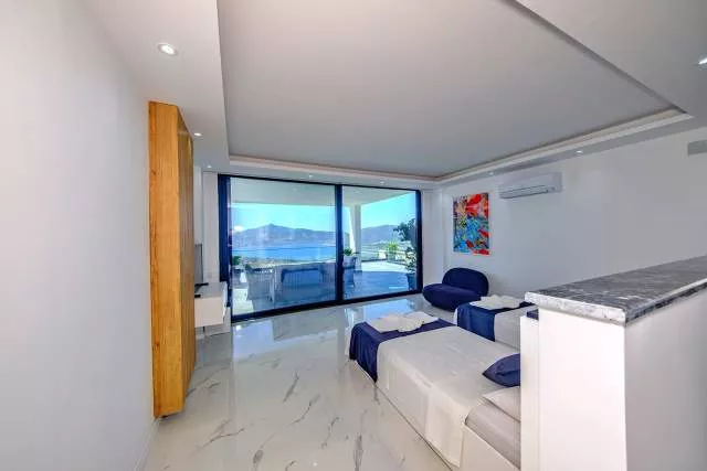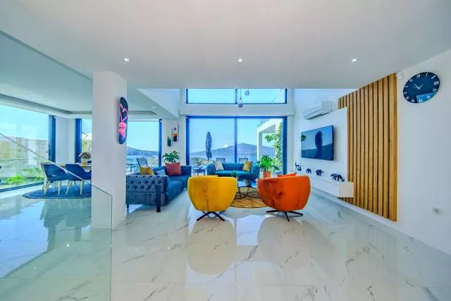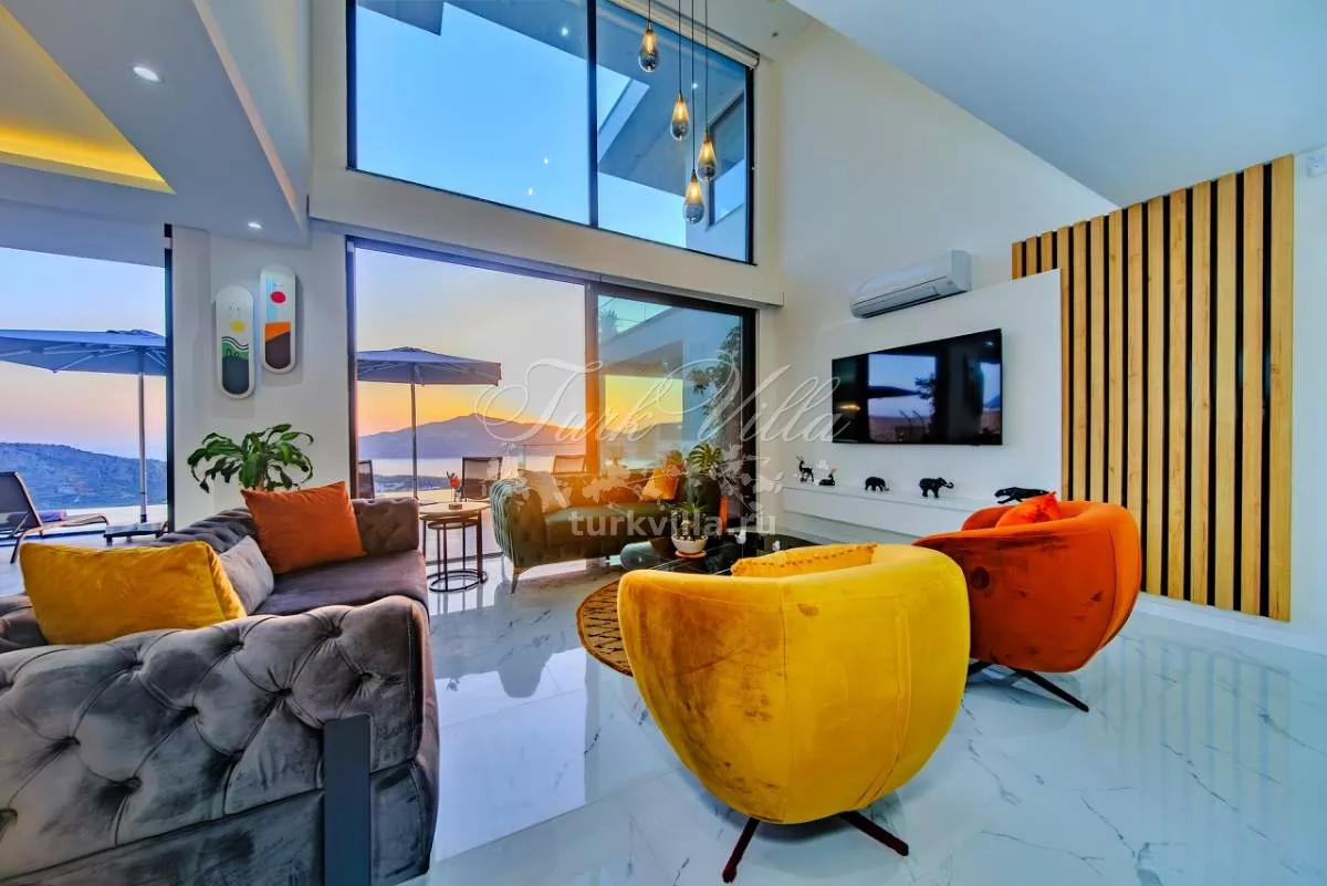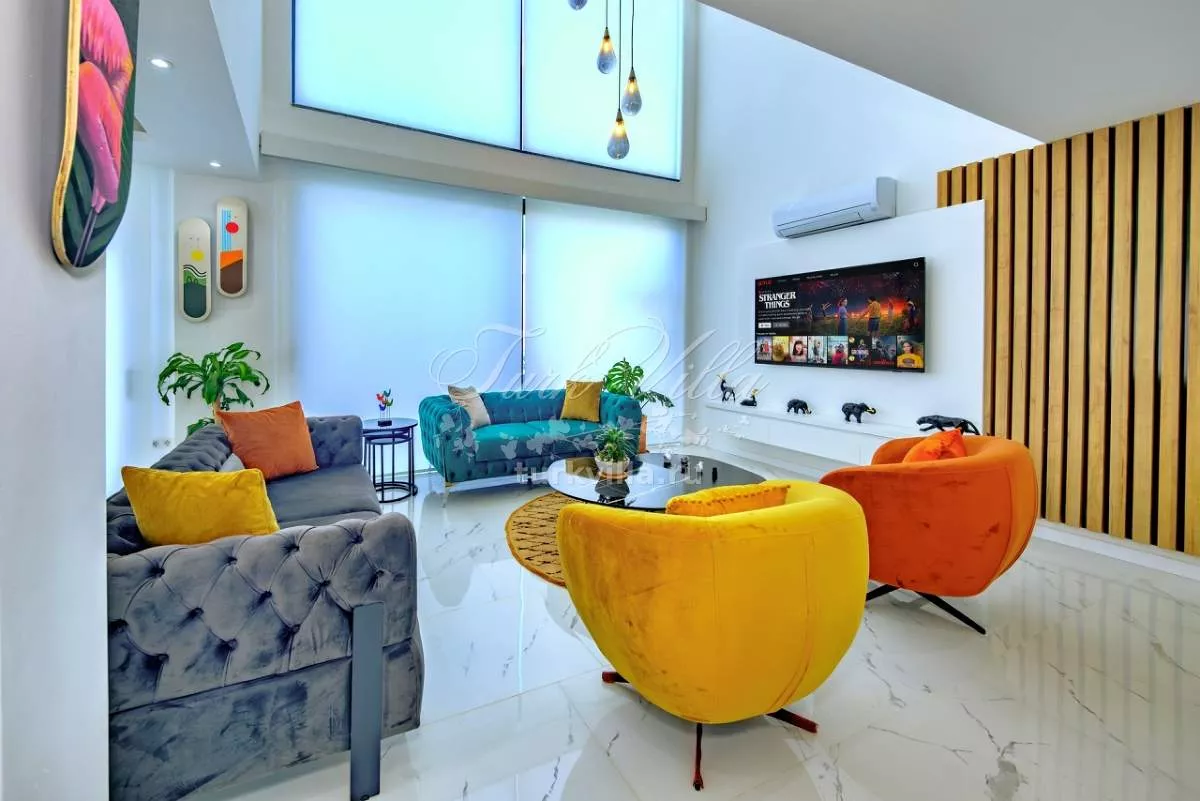 В гостиной находятся роскошная мягкая мебель, 65-дюймовый 4K Ultra HD Amoled Smart LED TV, кондиционер, обеденный стол, диван-тройка, диван-двойка и два одиночных кресла. Находясь в гостиной, вы можете наслаждаться панорамным видом на море и город, отдыхая на удобных креслах и наблюдая закат.