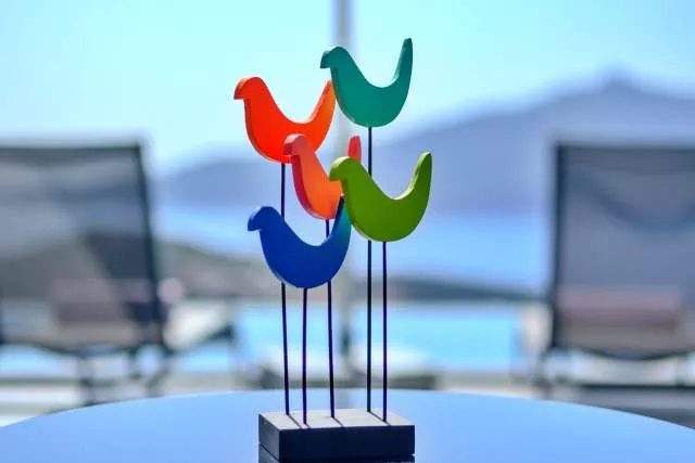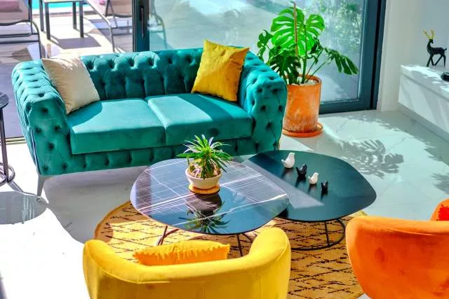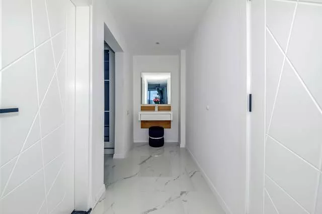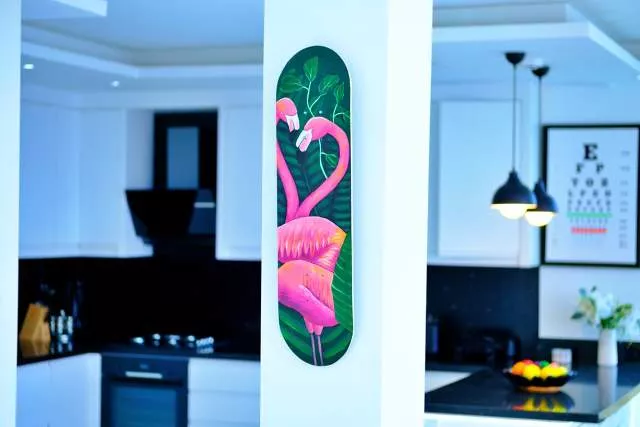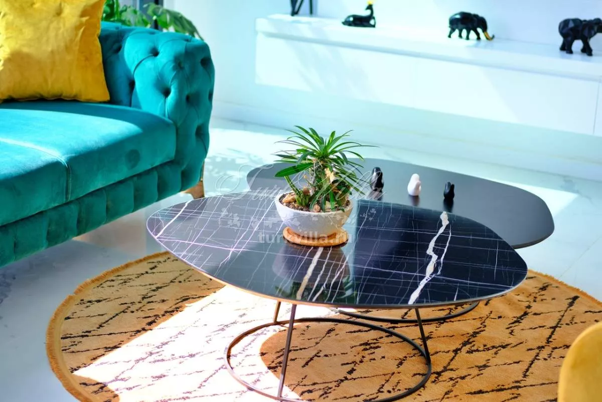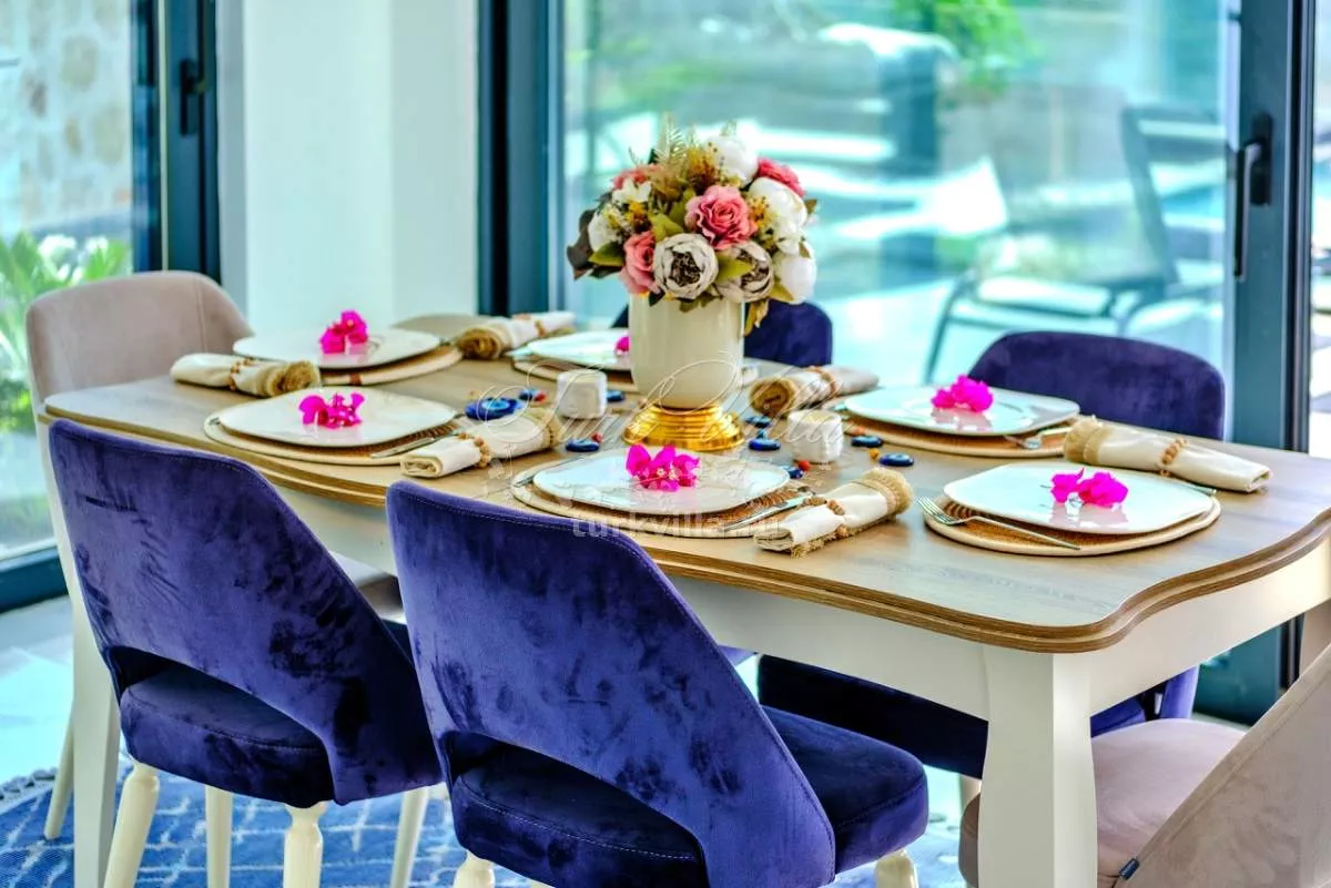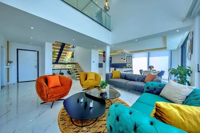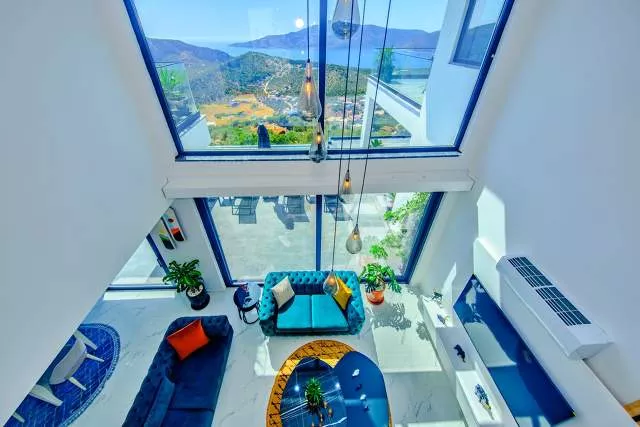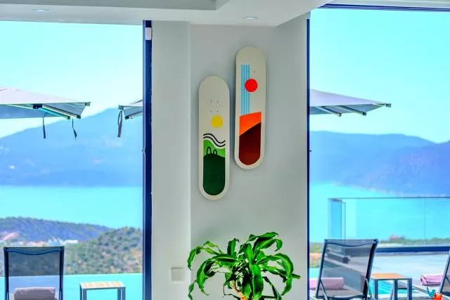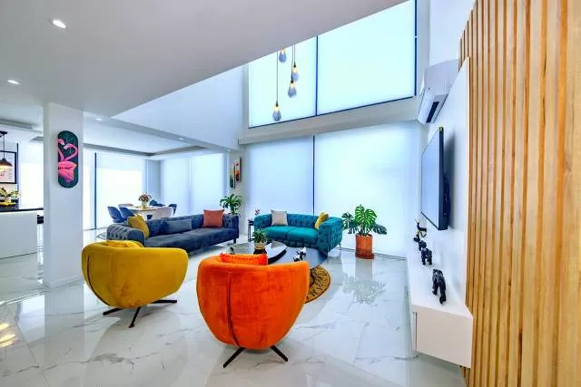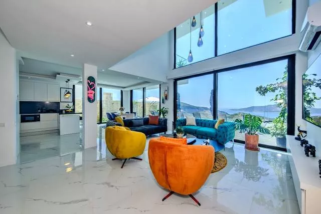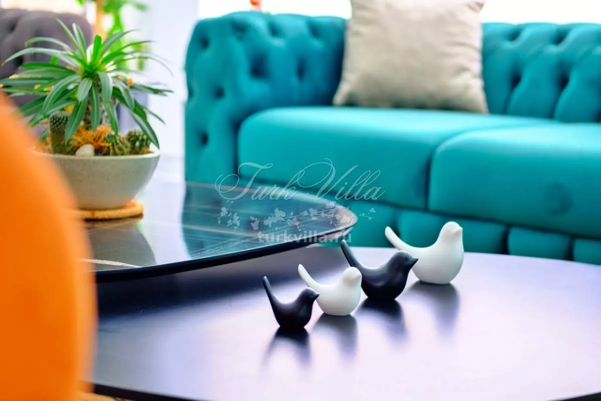 В гостиной находятся роскошная мягкая мебель, 65-дюймовый 4K Ultra HD Amoled Smart LED TV, кондиционер, обеденный стол, диван-тройка, диван-двойка и два одиночных кресла. Находясь в гостиной, вы можете наслаждаться панорамным видом на море и город, отдыхая на удобных креслах и наблюдая закат.