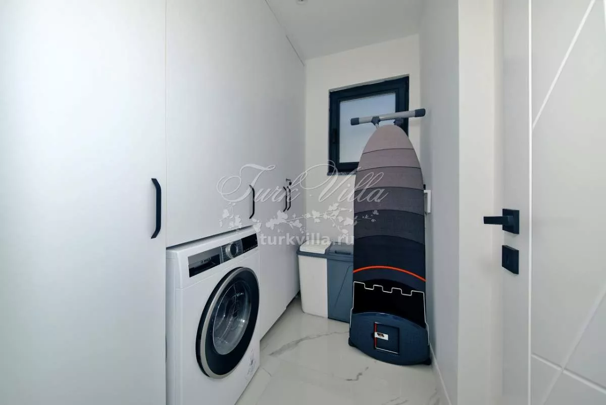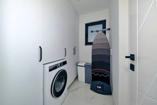Оснащена стиральной машиной, утюгом, гладильной доской, сушилкой, корзиной для белья и пылесосом.