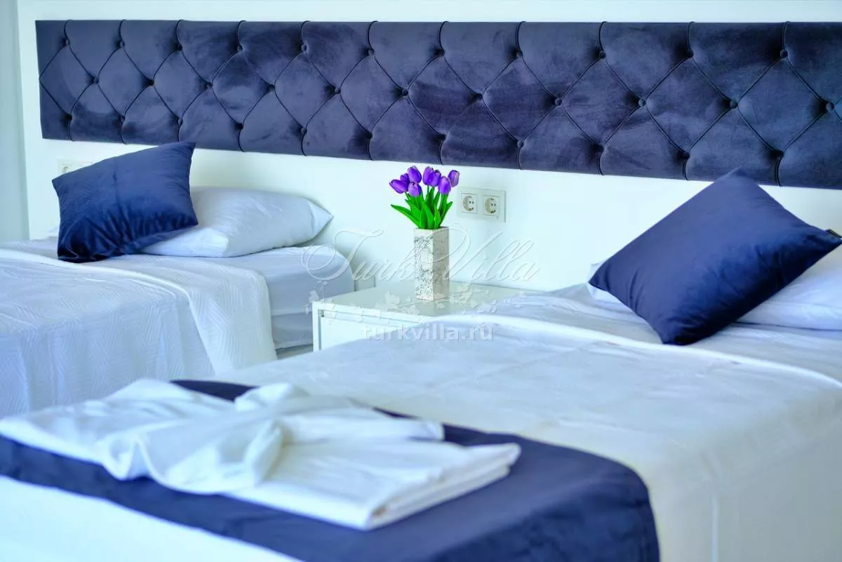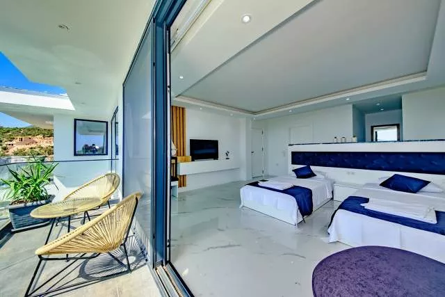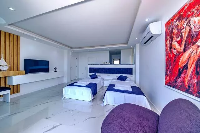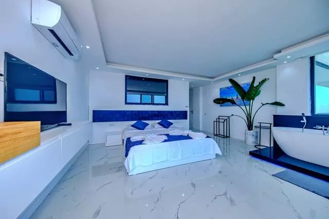 На верхнем этаже. Включает двуспальную кровать (180x200 см), туалетный столик, фен, пуф, кондиционер, Smart LED TV, гардероб, зеркало, тумбочку, детскую кроватку, сейф, ванную с видом на море и балкон.