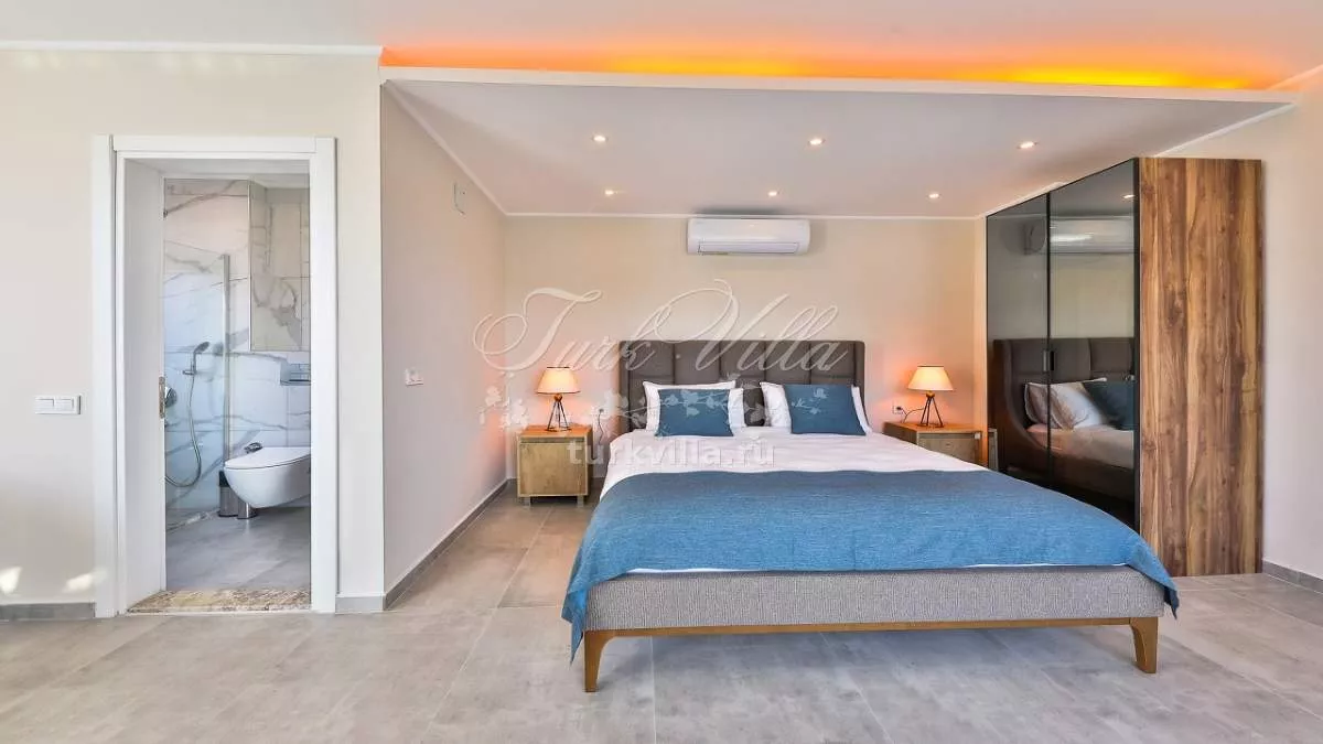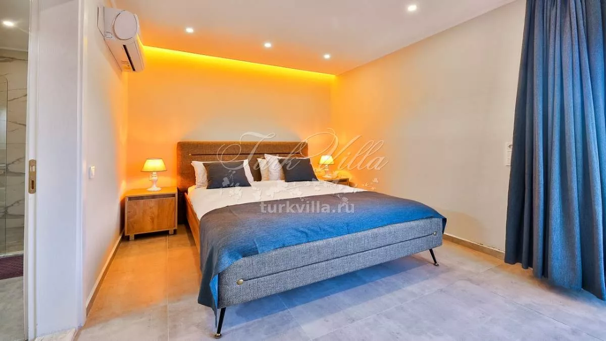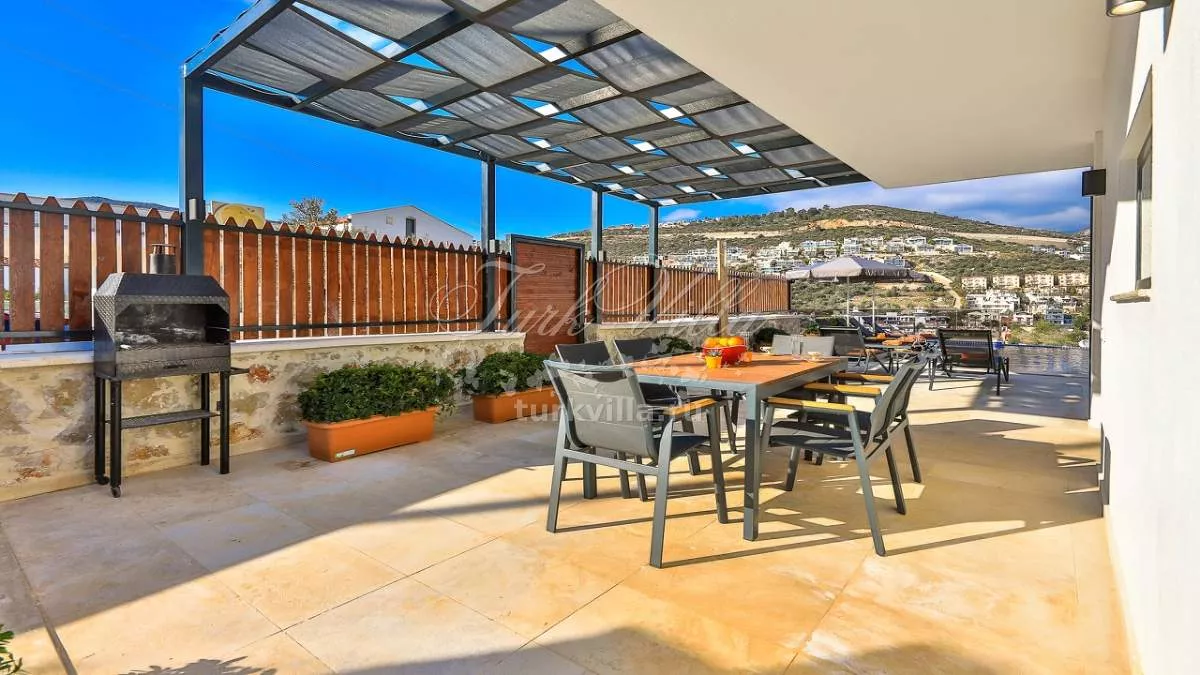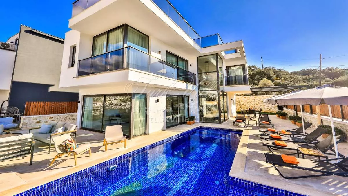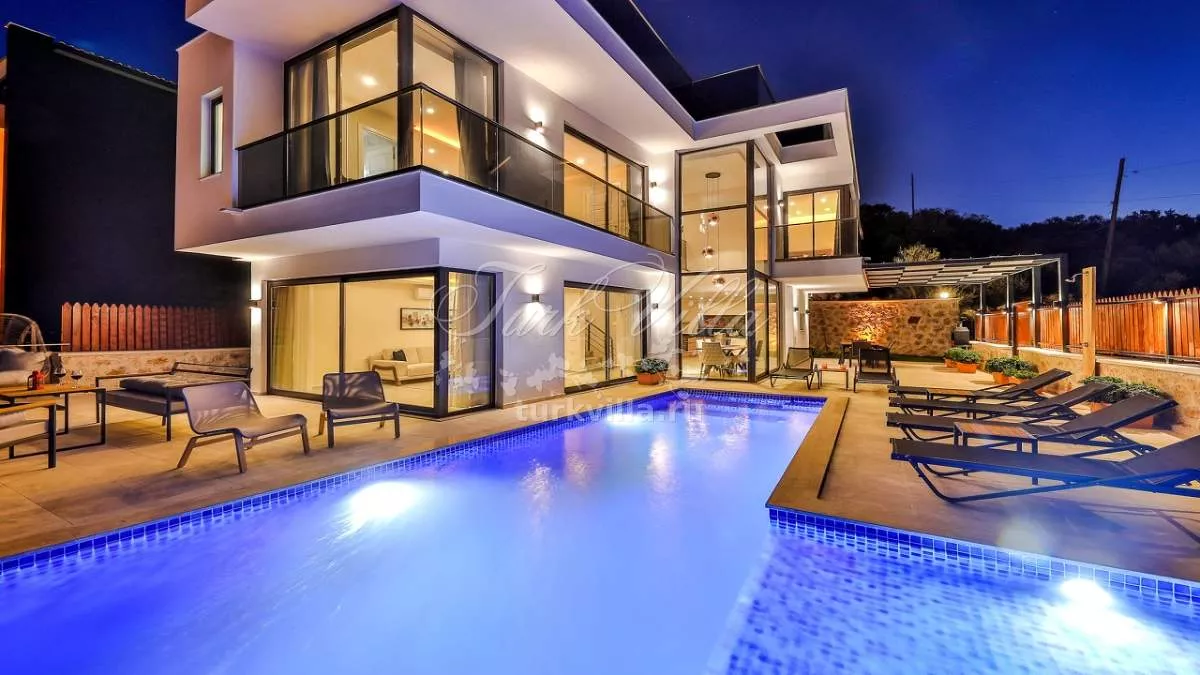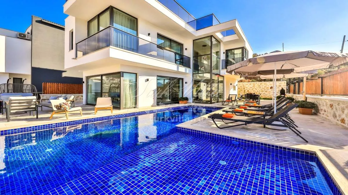 Вилла расположена в живописном районе Калкан Каламар. Она включает три просторные спальни, каждая с собственной ванной комнатой, и может комфортно разместить до шести человек. На территории имеется частный бассейн с террасой, где расположены качели, мангал, зонтики и шезлонги. Вилла оснащена современной американской кухней, оборудованной всем необходимым, и уютной гостиной с видом на бассейн. Расстояние до центра Калькана составляет 1,2 км, а ближайший пляж находится всего в 1 км.