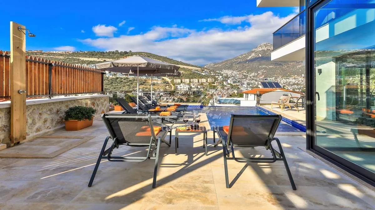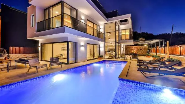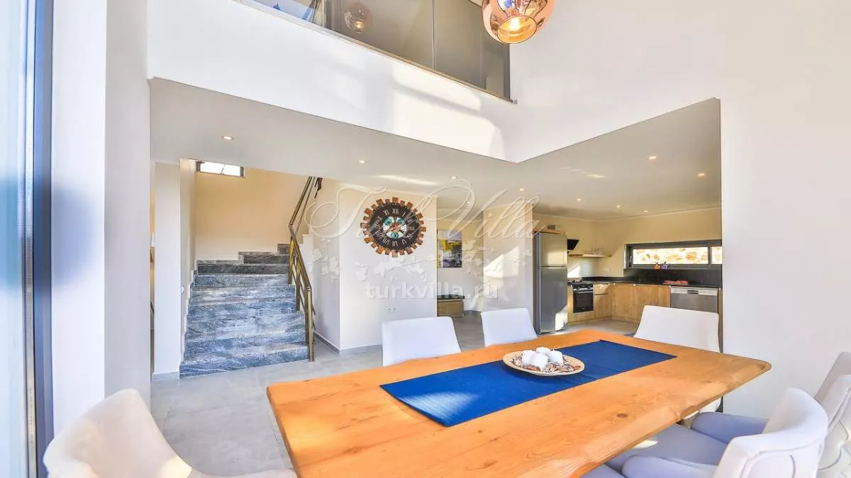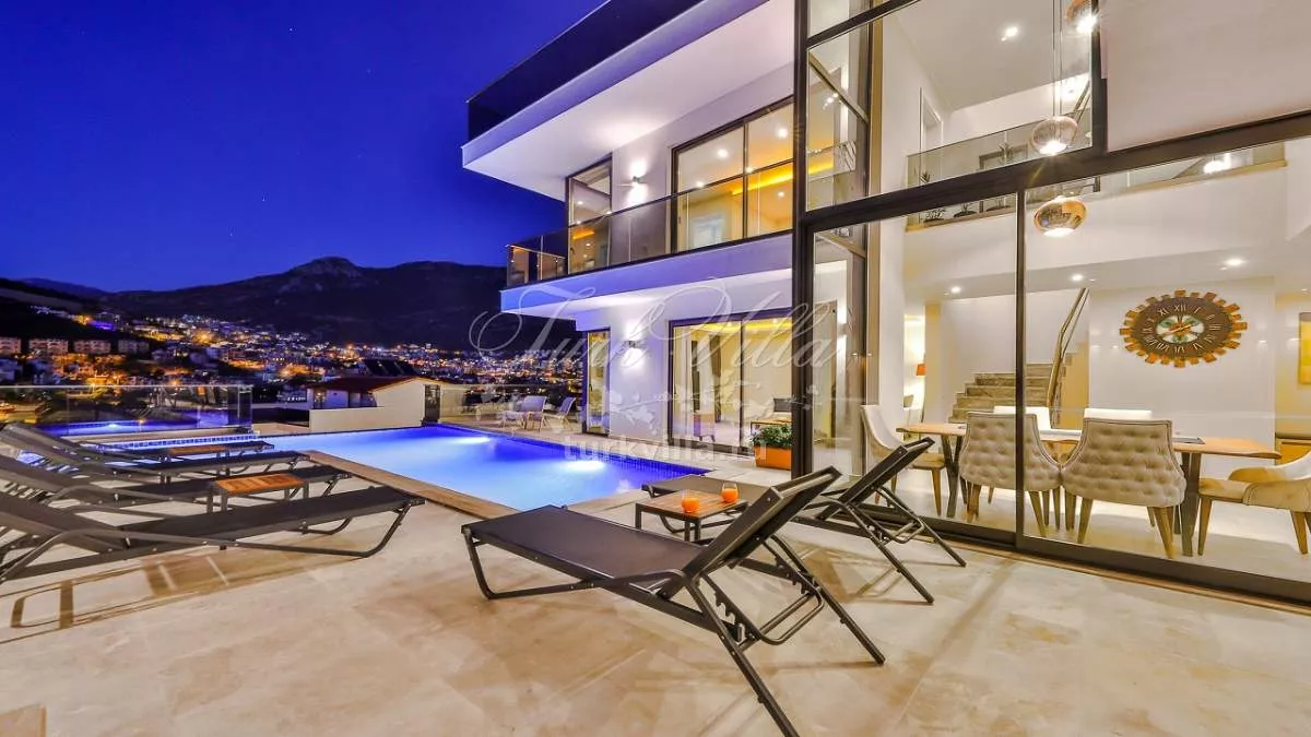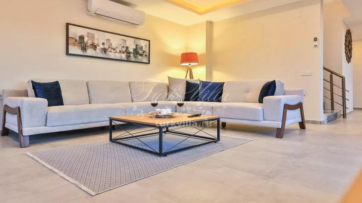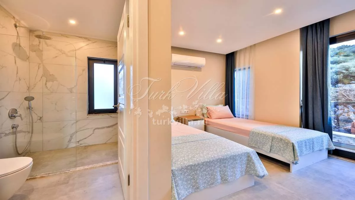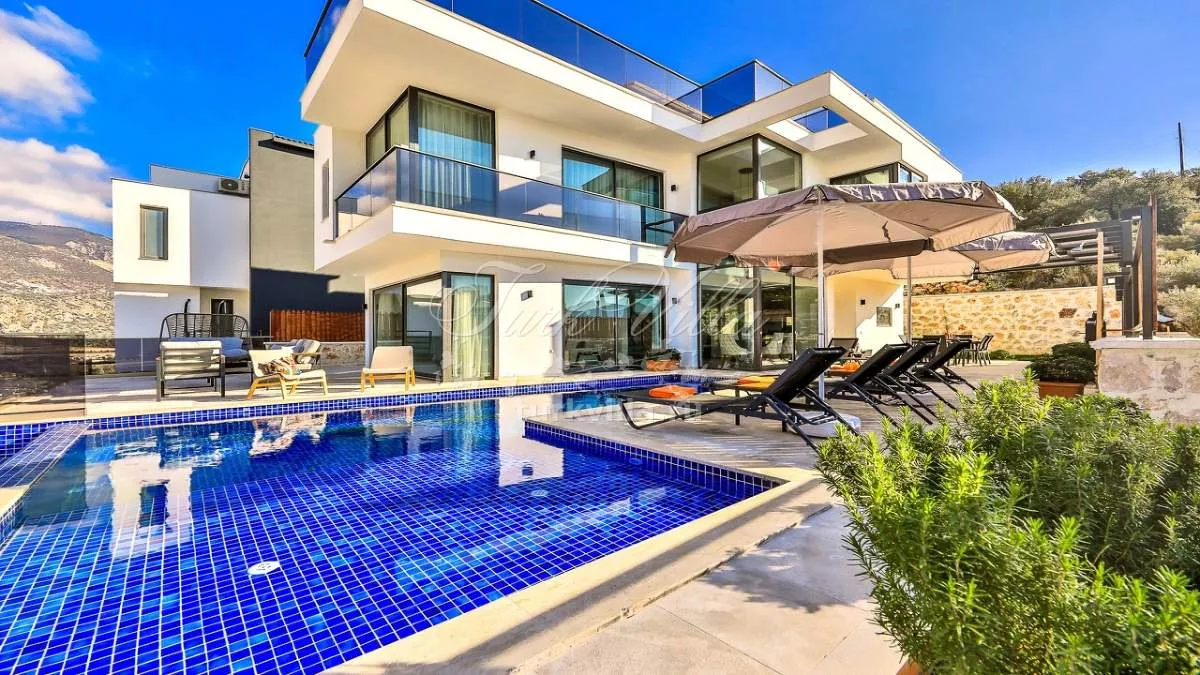 Вилла расположена в живописном районе Калкан Каламар. Она включает три просторные спальни, каждая с собственной ванной комнатой, и может комфортно разместить до шести человек. На территории имеется частный бассейн с террасой, где расположены качели, мангал, зонтики и шезлонги. Вилла оснащена современной американской кухней, оборудованной всем необходимым, и уютной гостиной с видом на бассейн. Расстояние до центра Калькана составляет 1,2 км, а ближайший пляж находится всего в 1 км.