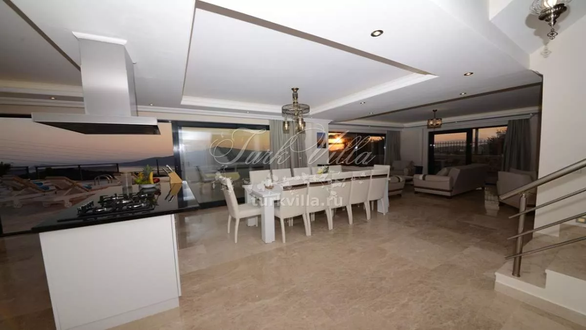 - Просторная, современная кухня с открытой планировкой, объединенная с гостиной, выходящей на террасу у бассейна