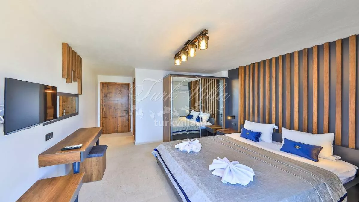 1. Спальня 1: двуспальная кровать, ванная комната, гардероб, прикроватная тумбочка, джакузи и кондиционер.