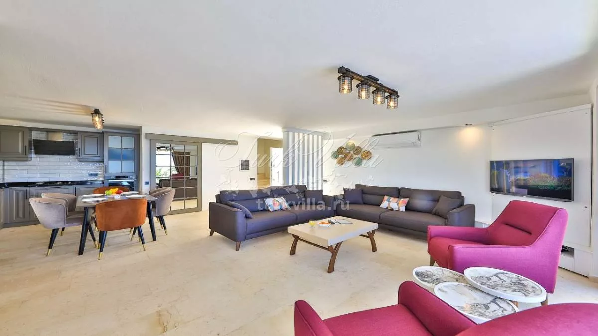 - Гостиная: комфортная гостиная с видом на море и выходом на террасу у бассейна. Оснащена диваном, спутниковым телевидением, DVD-плеером, беспроводным интернетом и кондиционером, а также столом на 8 человек.