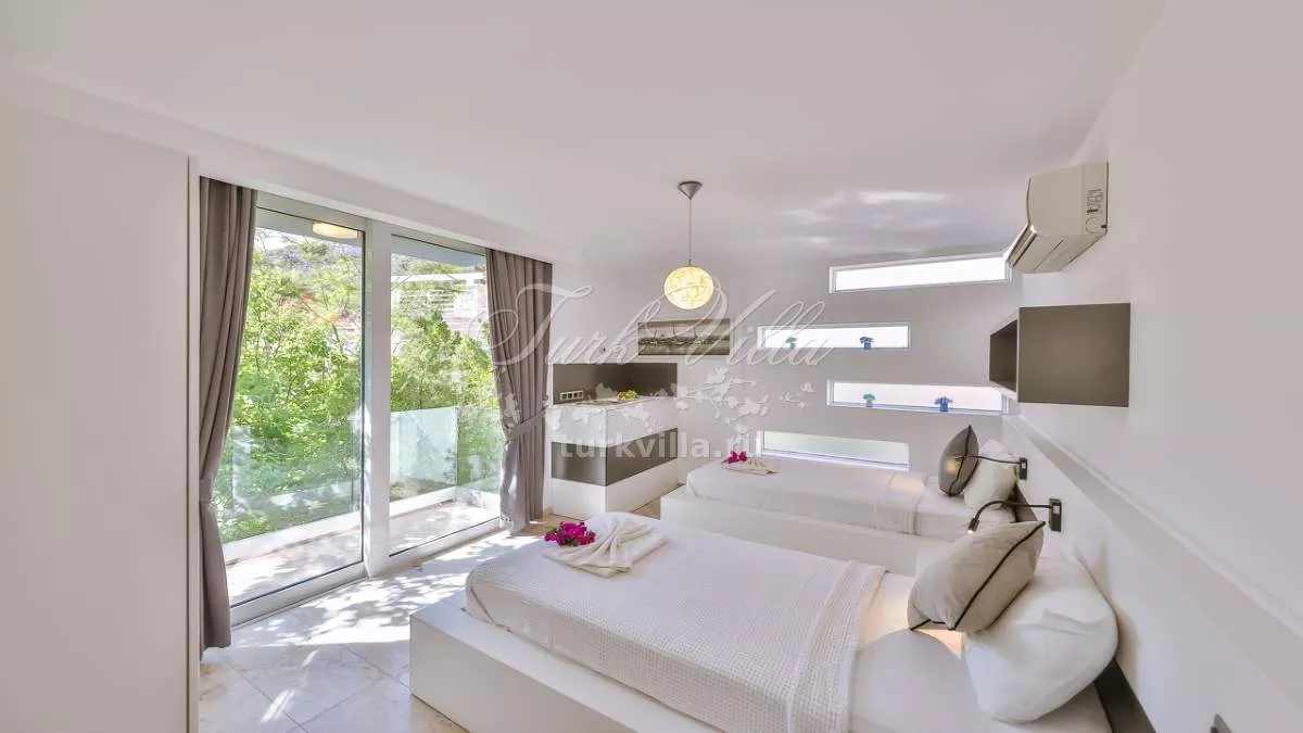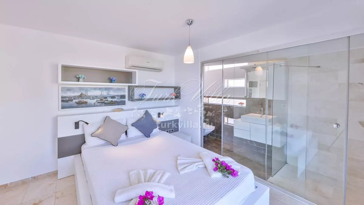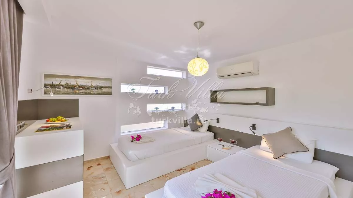 - Спальня 4 (люкс-семейная): двуспальная кровать с видом на море и природу, кондиционер, ванная комната, джакузи, балкон.