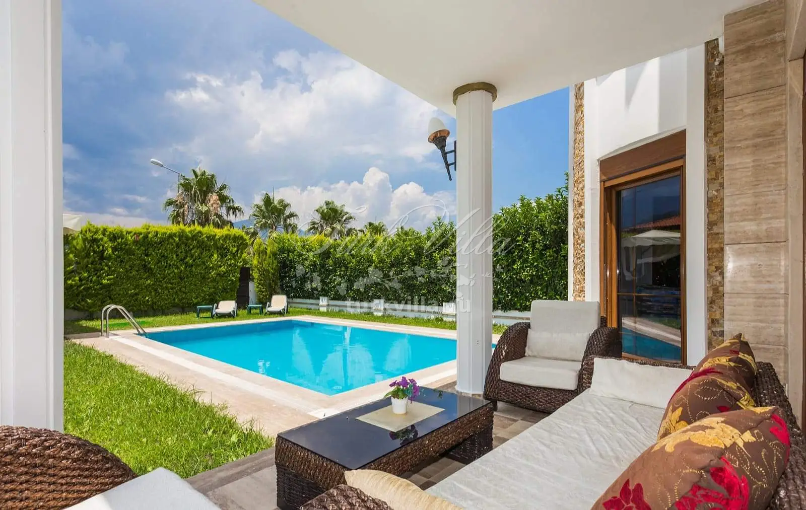 На территории виллы частный сад, частный бассейн, шезлонги, мебель для отдыха.
