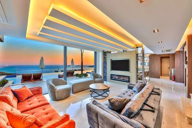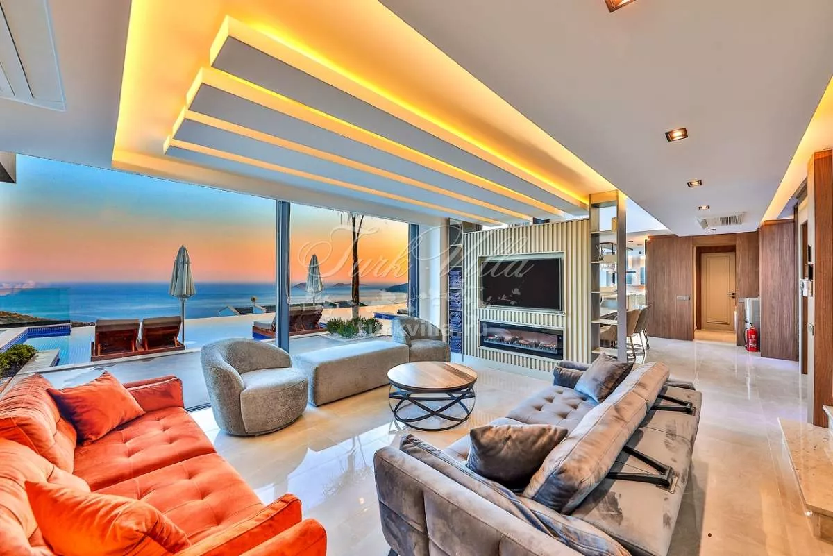 Просторная гостиная создана для комфортного отдыха. Здесь есть удобный диван, телевизор, кондиционер, а также выход на террасу с бассейном и видом на море.