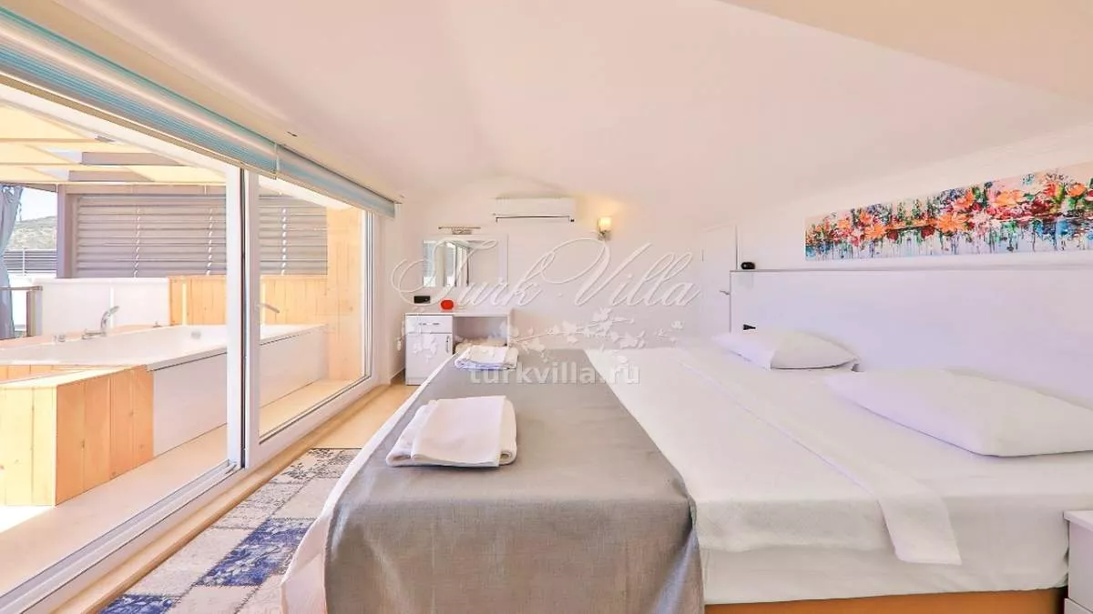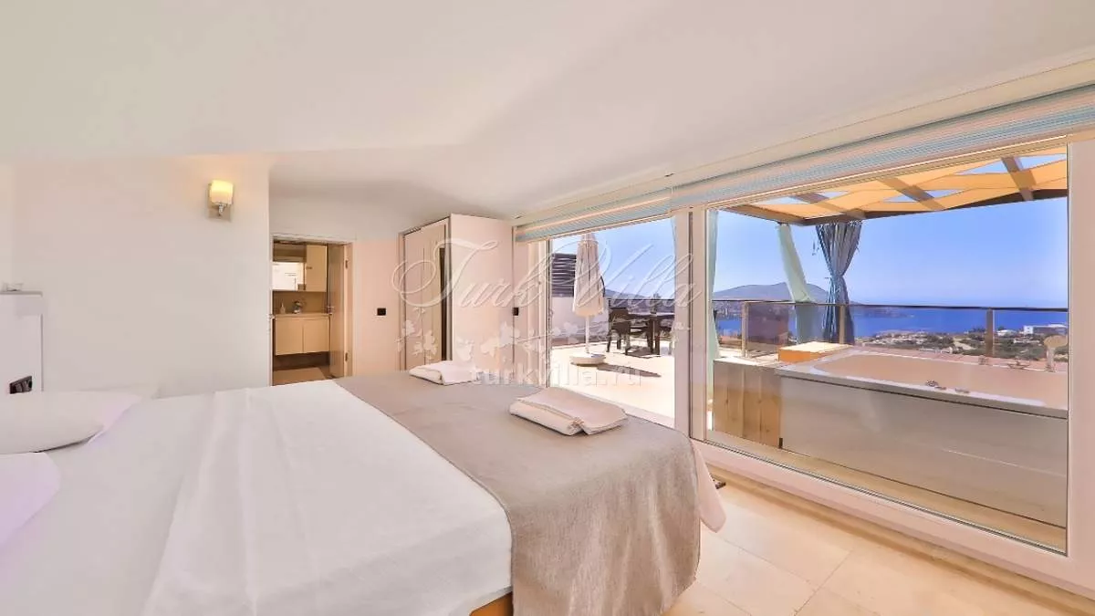 Третья спальня (семейный люкс с джакузи) - элегантная комната с двуспальной кроватью, гардеробом, прикроватными тумбочками, кондиционером, собственной ванной комнатой и балконом с видом на море. В спальне также установлено джакузи для максимального комфорта гостей.