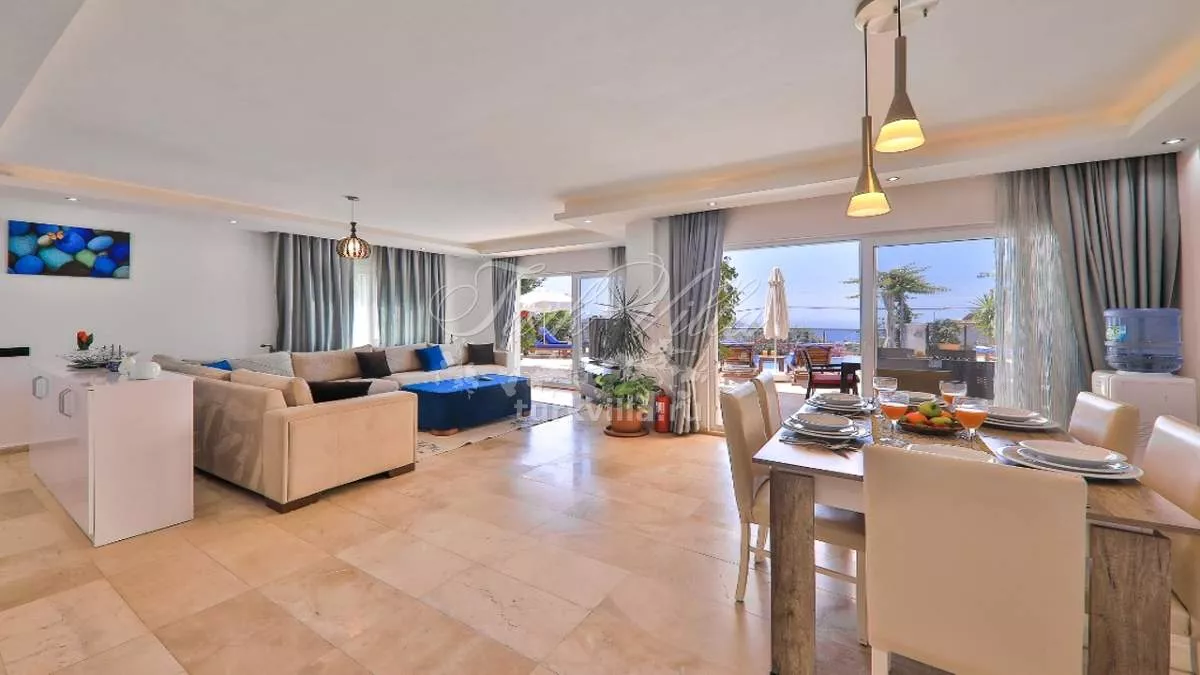 Гостиная - просторная и светлая зона отдыха с панорамными окнами, выходом на террасу у бассейна, стильной мебелью, телевизором со спутниковыми каналами, кондиционером, обеденным столом на 6 персон, а также отдельным туалетом с раковиной.
