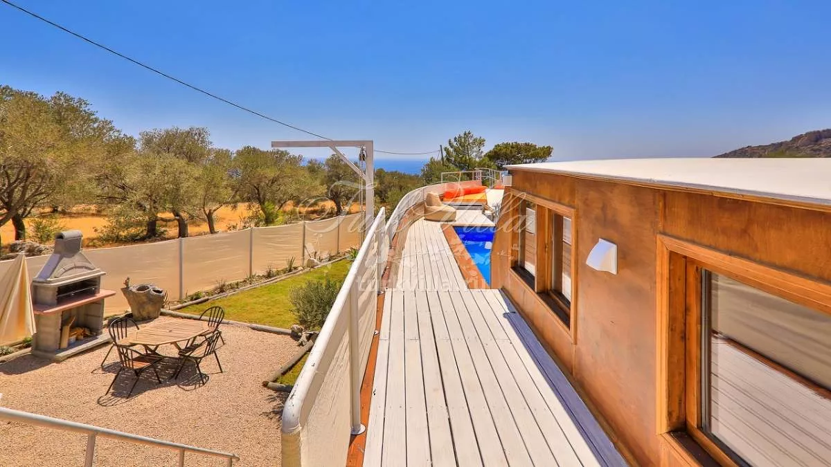 При входе гостей встречает уютный сад с зоной для барбекю. Поднявшись по лестнице, можно попасть на просторную террасу на палубе, где расположены бассейн, шезлонги, обеденный стол и мягкие зоны для отдыха. Здесь можно наслаждаться прекрасными пейзажами и атмосферой уединения.