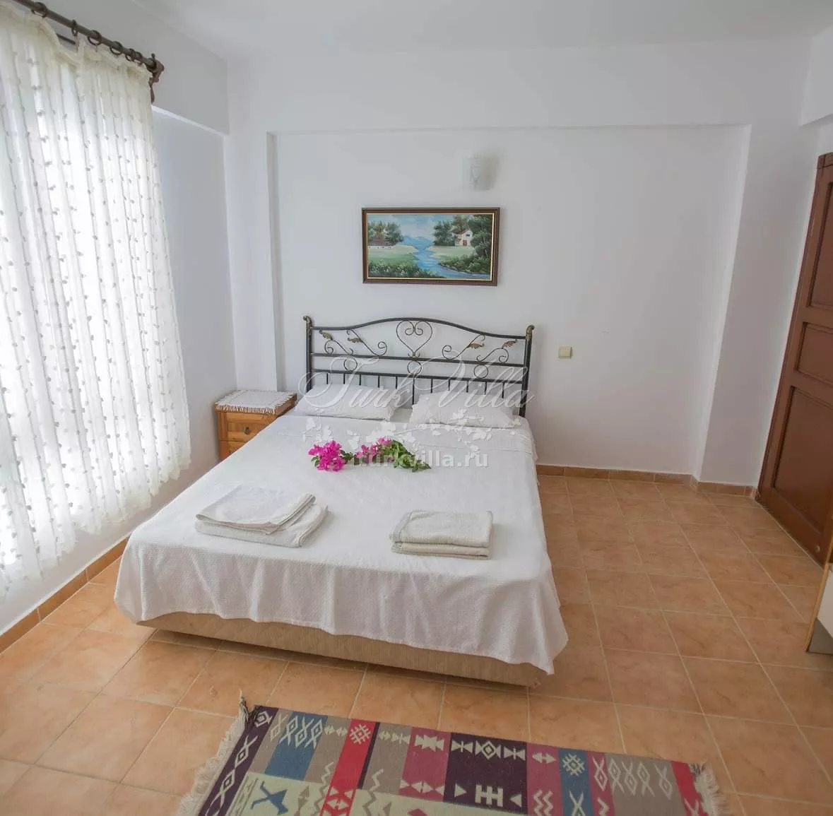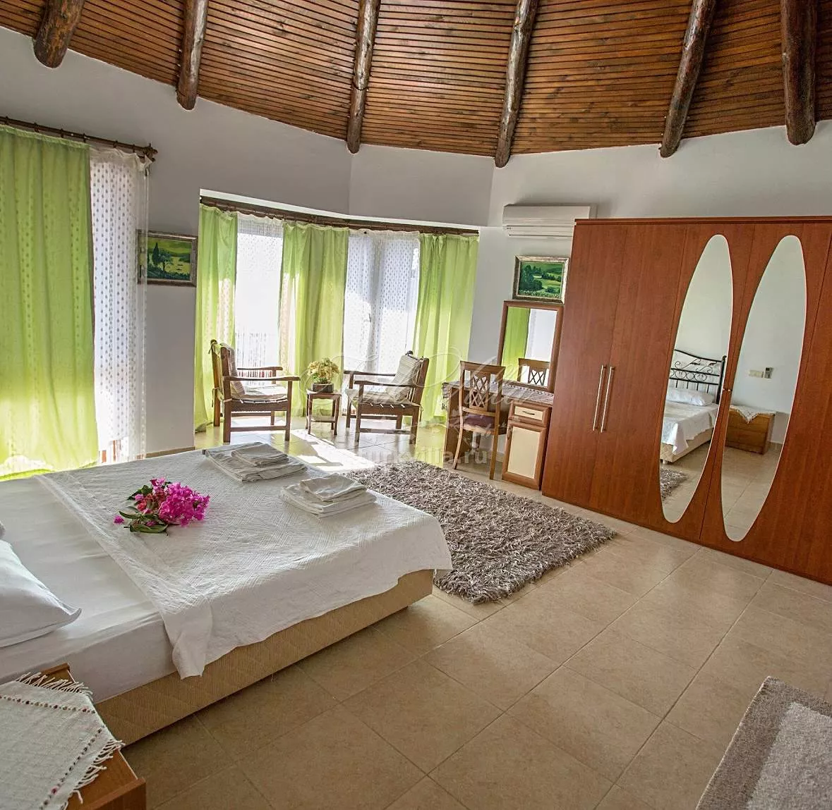 - Третья с двуспальной кроватью, ванной комнатой, гардеробом, кондиционером и балконом