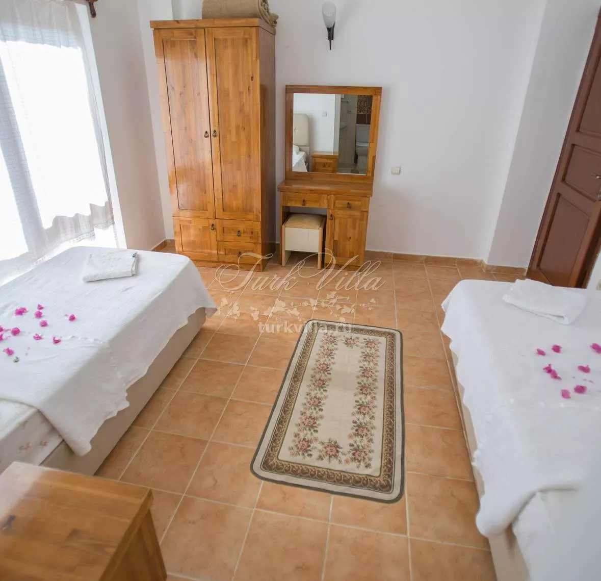 - Вторая с двумя односпальными кроватями, ванной комнатой, гардеробом, кондиционером и балконом