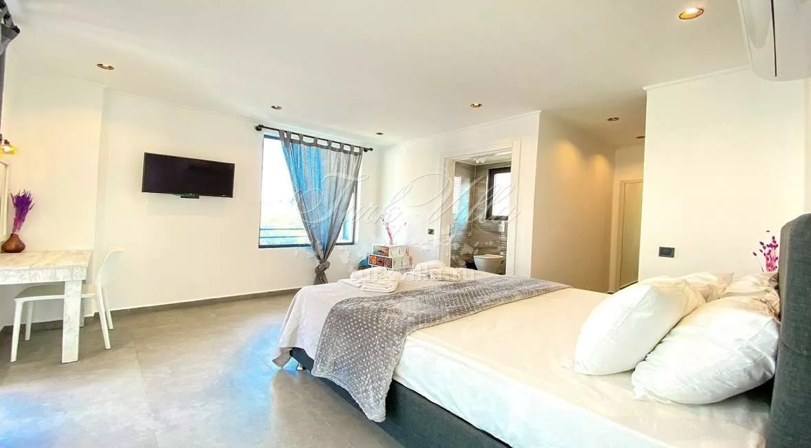 – Спальня с двуспальной кроватью, ванной комнатой, кондиционером, телевизором и выходом на террасу с джакузи