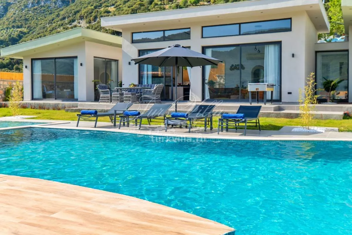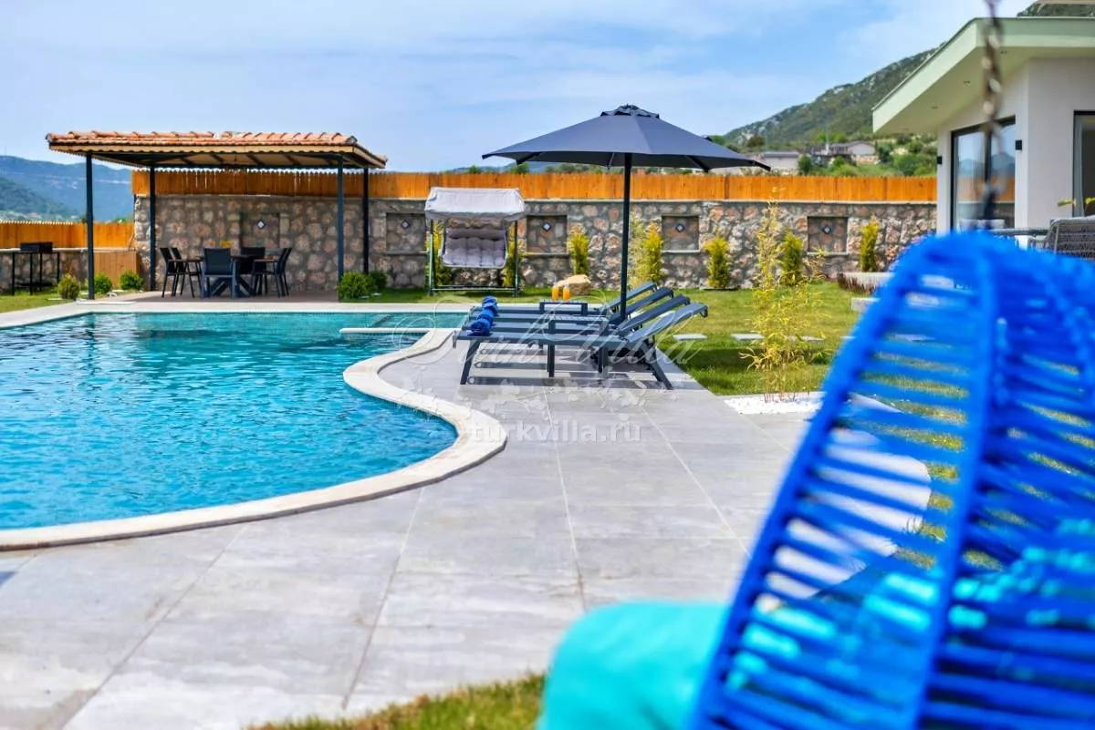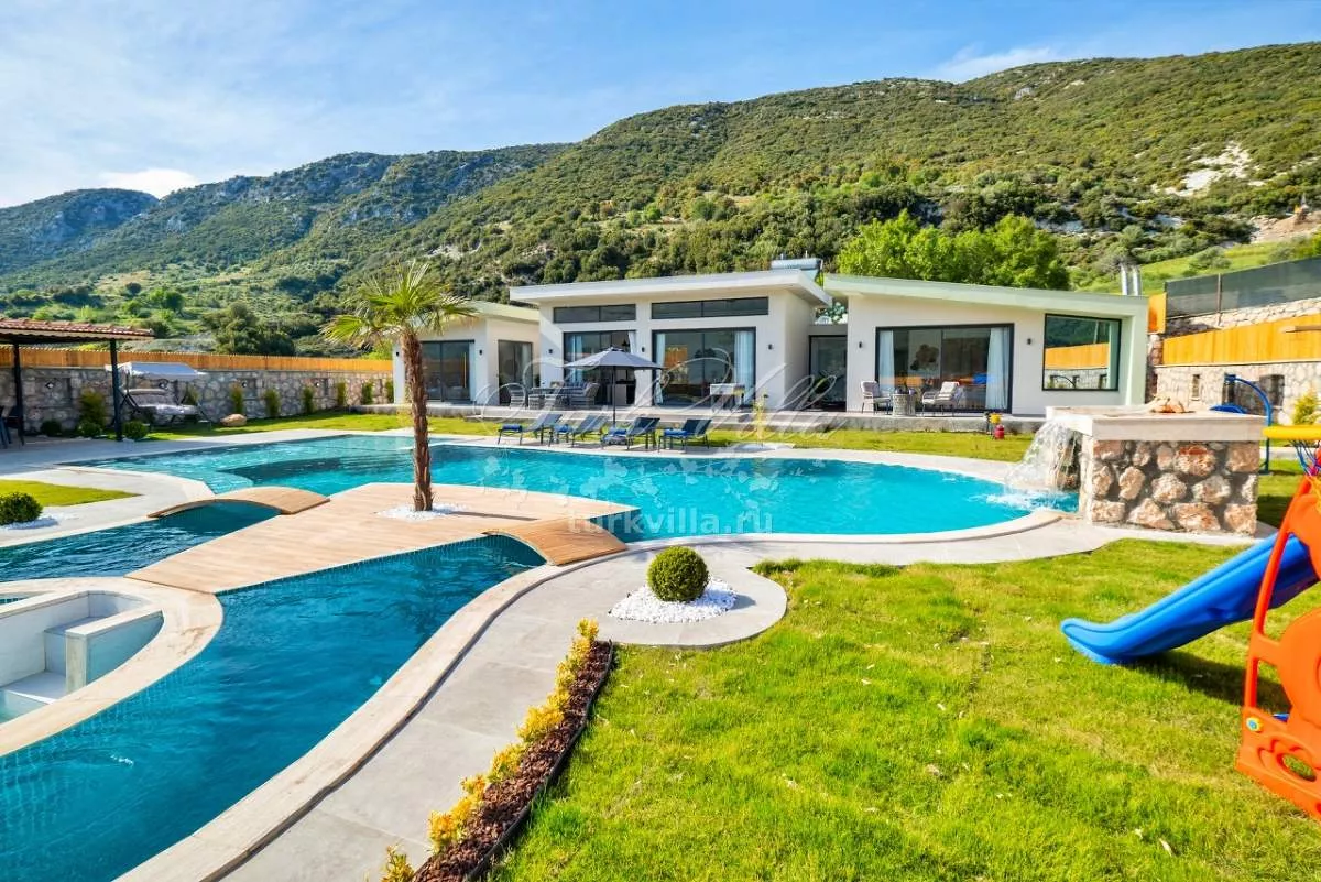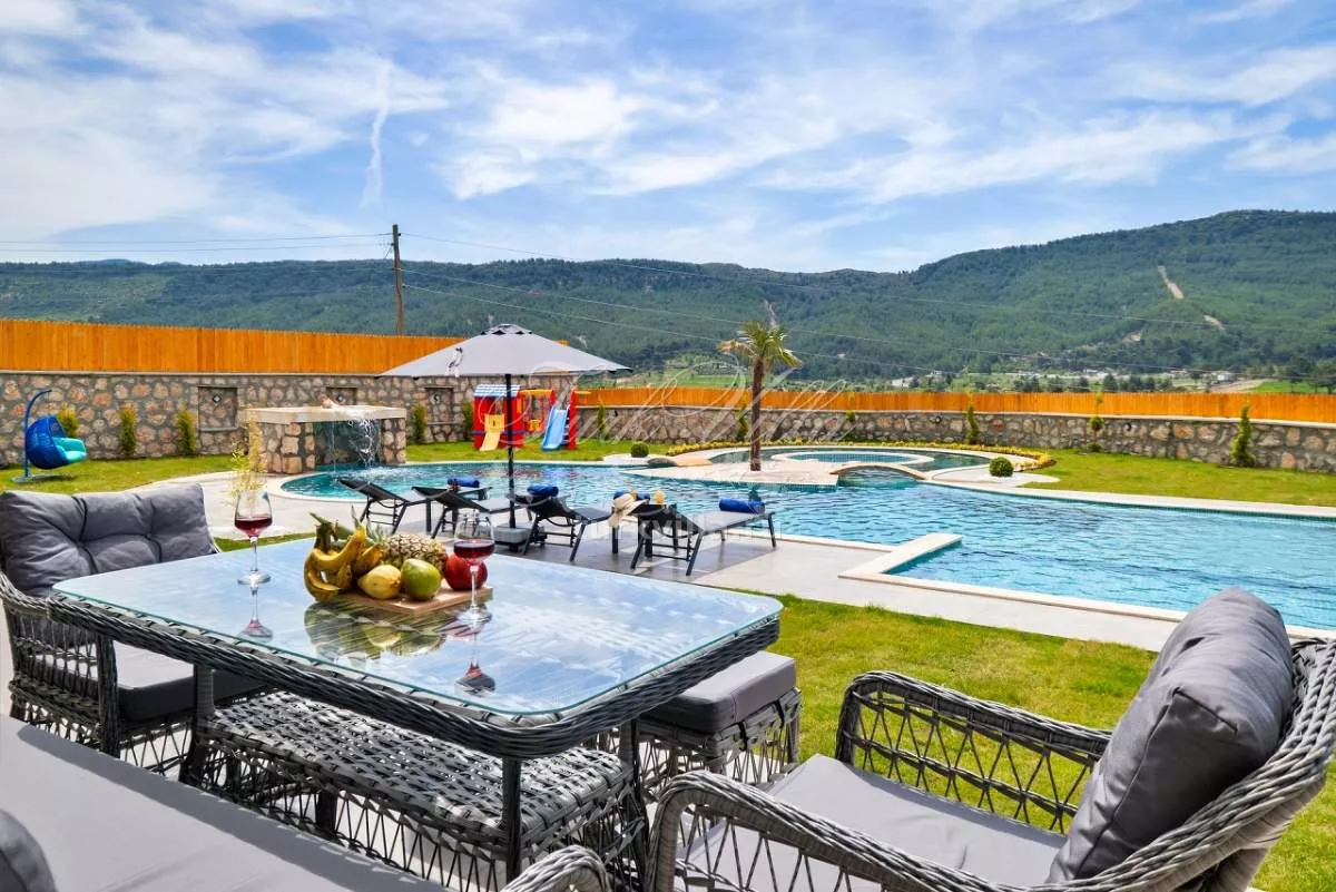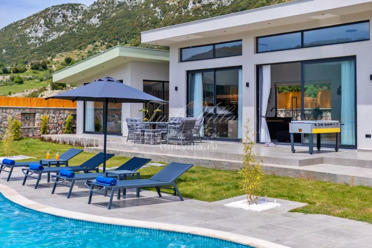 Вилла выделяется просторной территорией, панорамным видом и большим частным бассейном с террасой, скрытой от посторонних глаз. Здесь предусмотрены комфортные условия для отдыха: шезлонги, зонтики, удобные зоны для отдыха и обедов на свежем воздухе. Также на территории есть сауна, детская игровая площадка, настольный теннис и футбол, что делает эту виллу отличным выбором как для семей, так и для друзей.