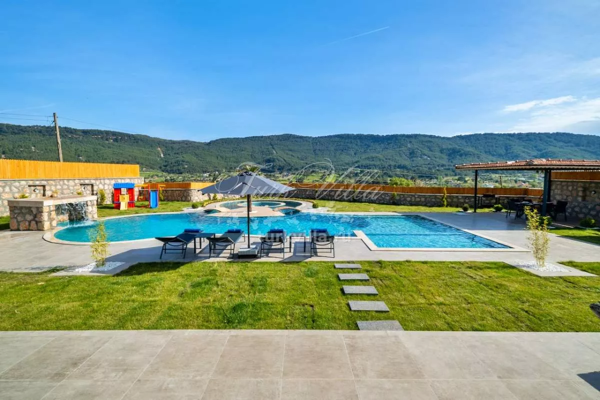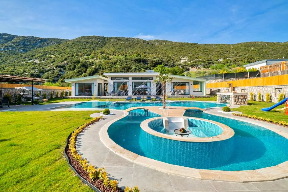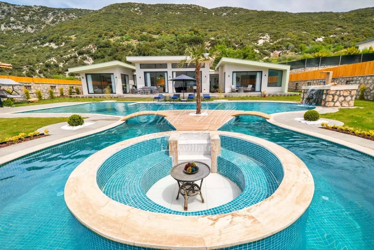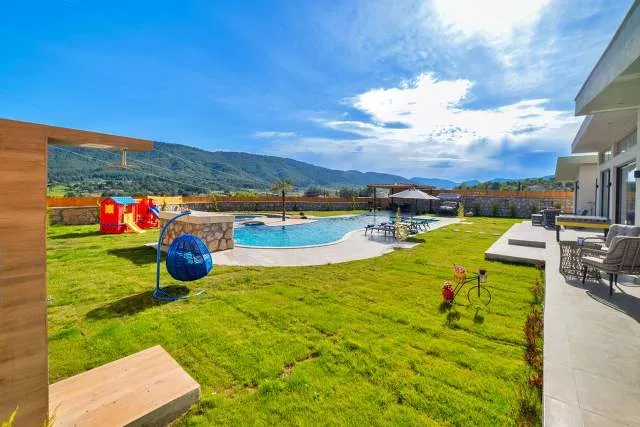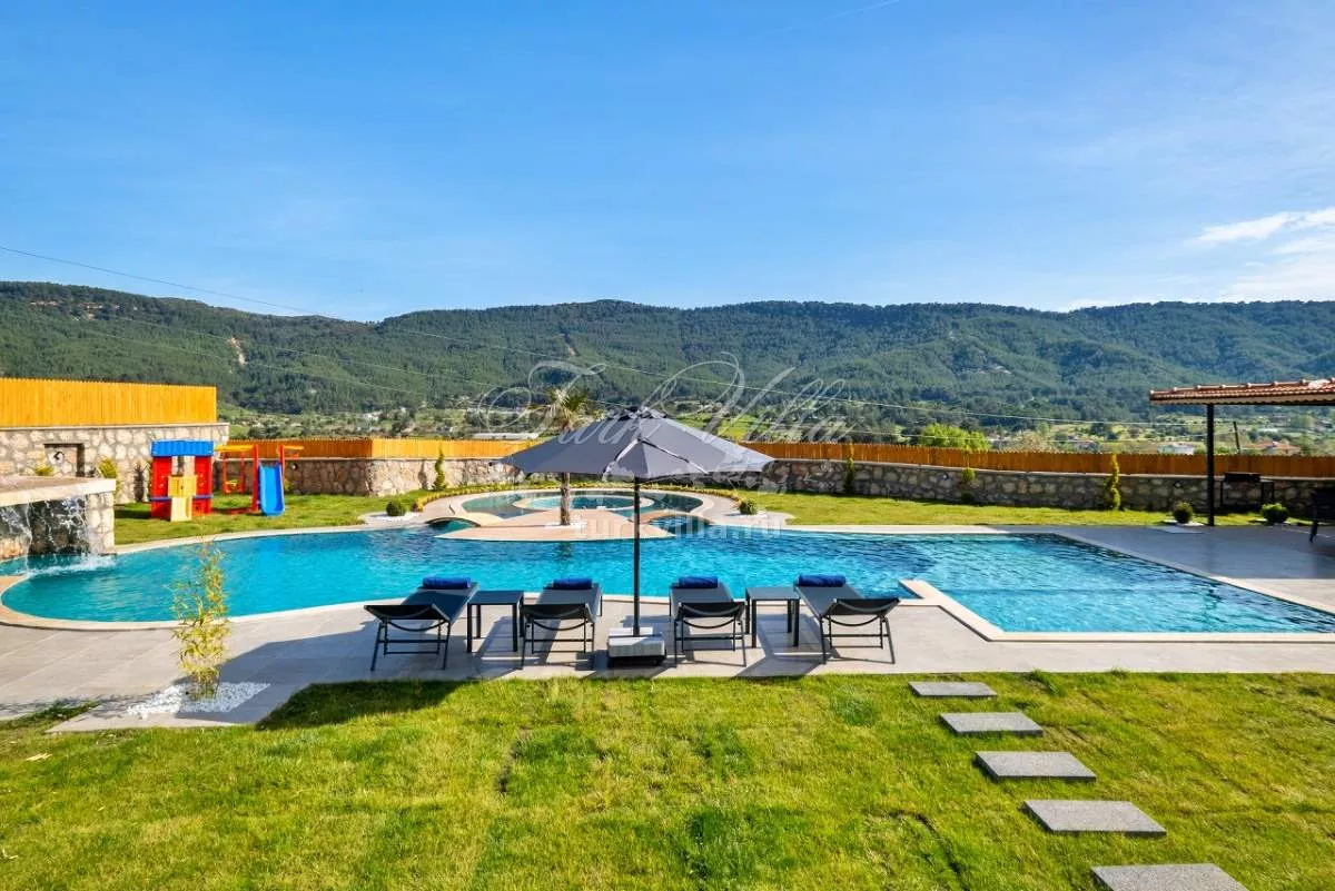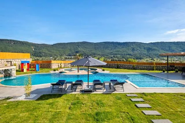 Вилла выделяется просторной территорией, панорамным видом и большим частным бассейном с террасой, скрытой от посторонних глаз. Здесь предусмотрены комфортные условия для отдыха: шезлонги, зонтики, удобные зоны для отдыха и обедов на свежем воздухе. Также на территории есть сауна, детская игровая площадка, настольный теннис и футбол, что делает эту виллу отличным выбором как для семей, так и для друзей.