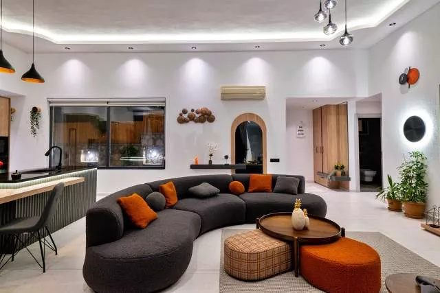 Просторная и светлая, с прямым выходом к бассейну, оснащена кондиционером, удобной мягкой мебелью, спутниковым телевидением, интернетом и обеденным столом.