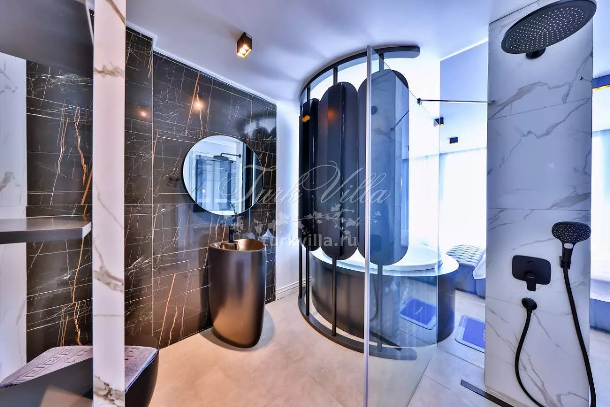 – Спальня 1: двуспальная кровать, ТВ, гардероб, комод, макияжный столик, джакузи, ванная комната