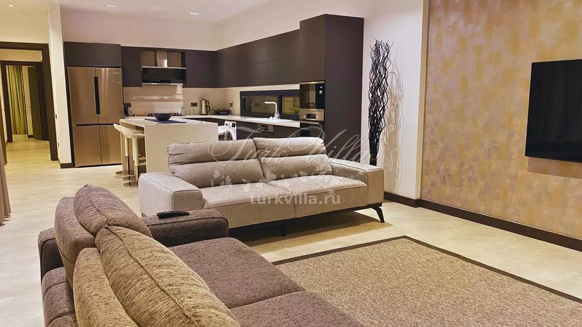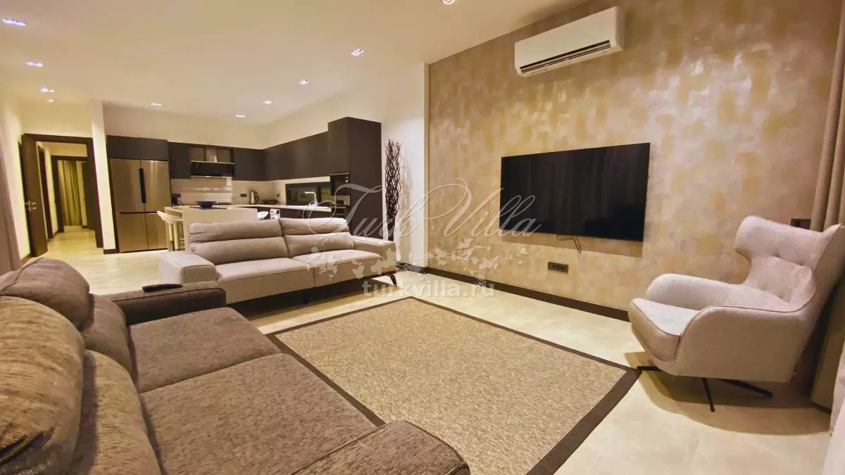 В двух спальнях установлены двуспальные кровати, в третьей — две односпальные. Интерьер оформлен в современном стиле с использованием качественной мебели. Максимальная вместимость — до 6 человек.