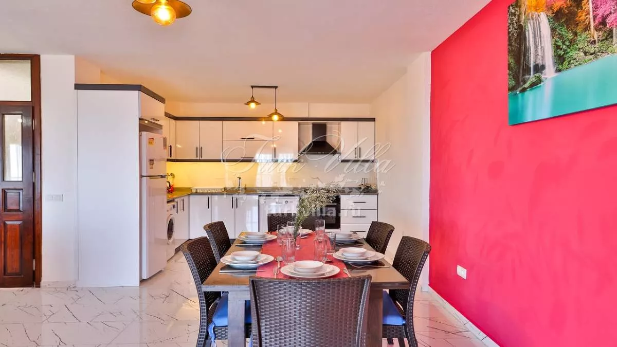 Первый этаж: просторная гостиная с выходом к бассейну, современная кухня открытого типа, обеденный стол на 8 персон, зона отдыха с диваном, телевизор с спутниковыми каналами и кондиционер. Кухня полностью оборудована: холодильник, посудомоечная и стиральная машины, духовка, варочная панель, микроволновая печь, полный набор посуды.